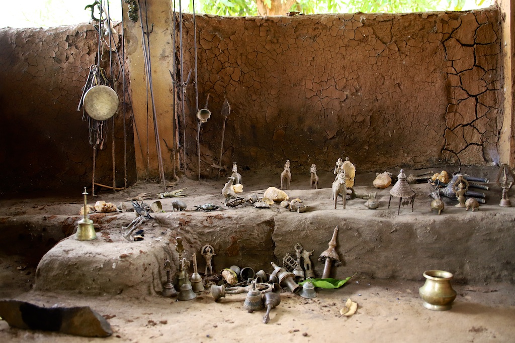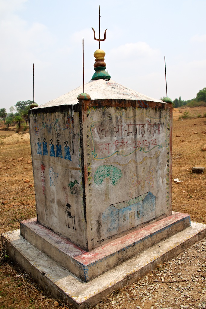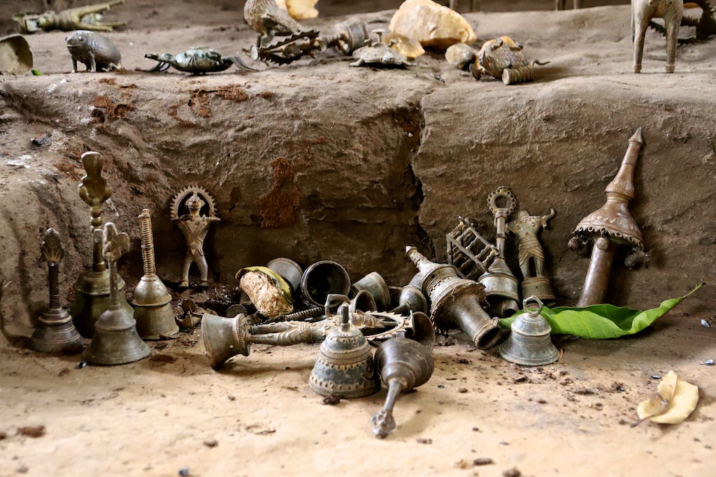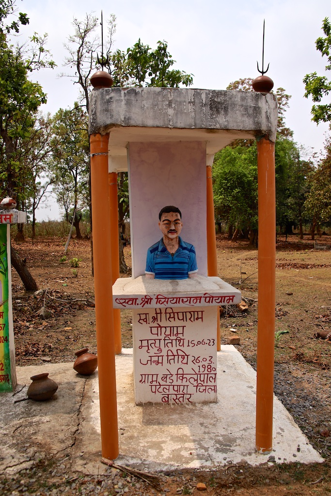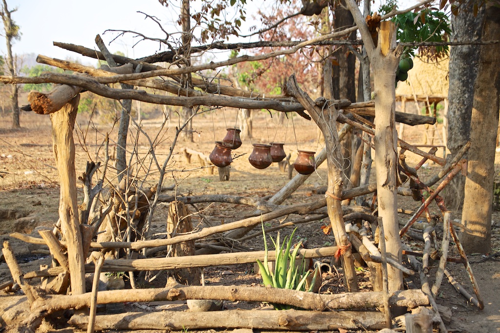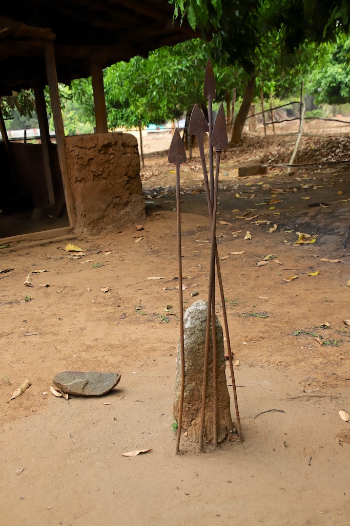 Les Bison Horn Maria sont animistes et célèbre entre autres les dieux de la nature …Les lances qui entourent le petit pilier au milieu de la cour est une défense contre les mauvais esprits. De nombreuses offrandes sont offertes aux déités comme le montre la photo suivante …