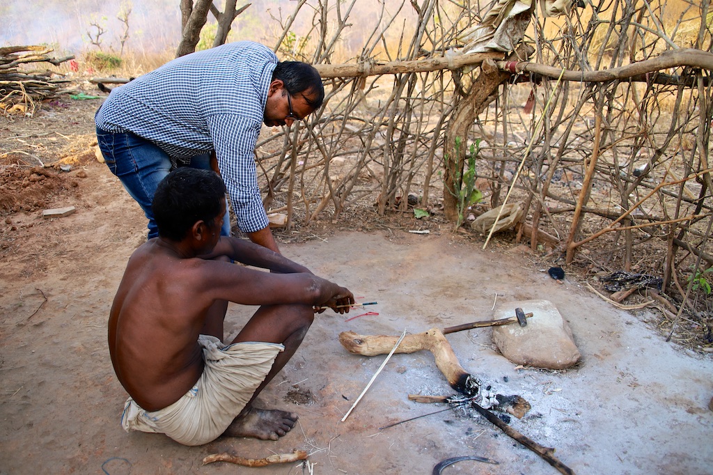 Les Baiga s’adonnent beaucoup à la chasse qui permet d’améliorer leur nouriiture quotidienne … Nous rencontrons (photo 2) un homme en train de fabriquer des flèches pour son arc. Il forge les pointes de flèches lui même et les insère dans une tige de bois dur.