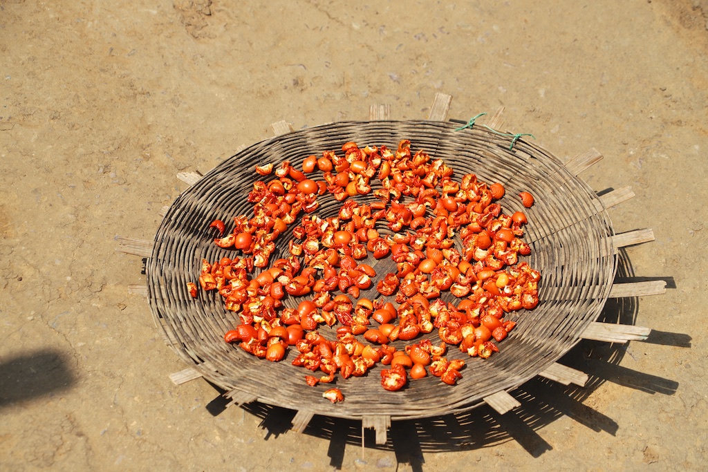 Une anecdote un peu douloureuse au sujet de cette dernière photo …nous nous approchons de cette femme qui collecte quelque chose sur le sol : en fait elle recherche des larves de fourmis rouges qui font partie de leur alimentation. Les fourmis très aggressive nous associent à cette femme et grimpent sur nous en nous pinçant méchamment : on met presque 3Omn pour s’en débarrasser car elles sont infiltrées partout !!!