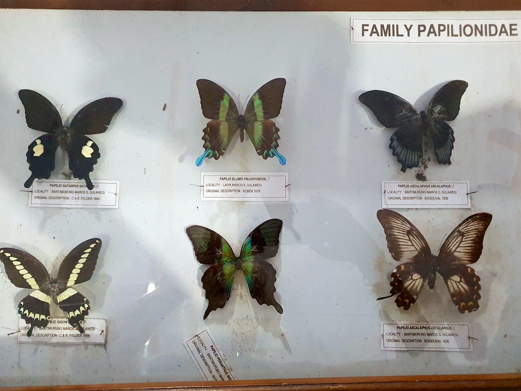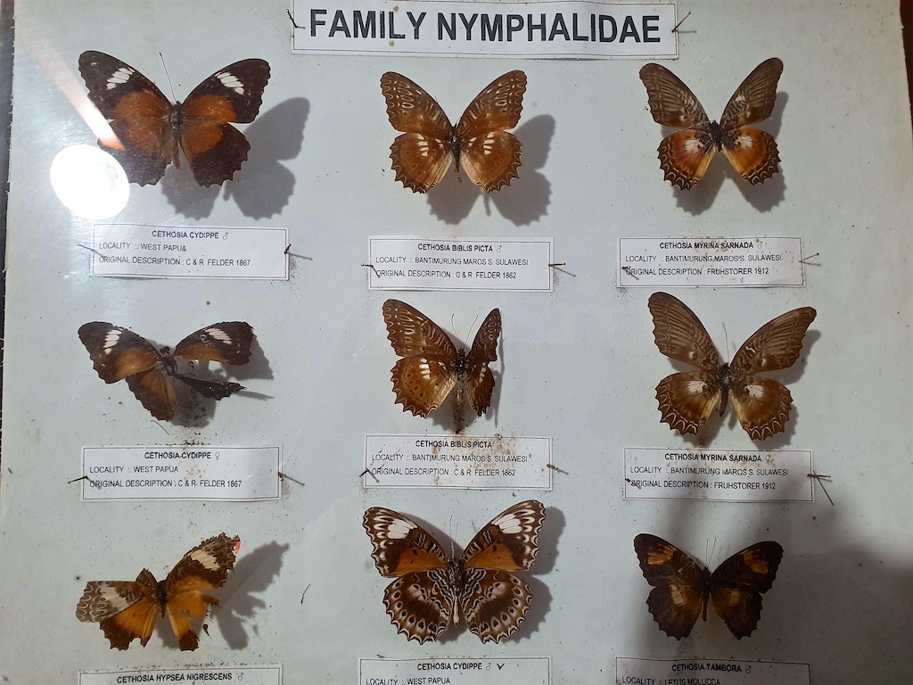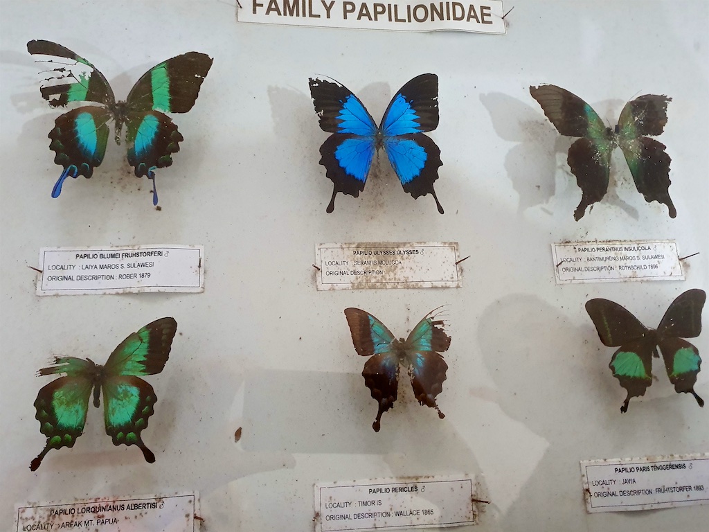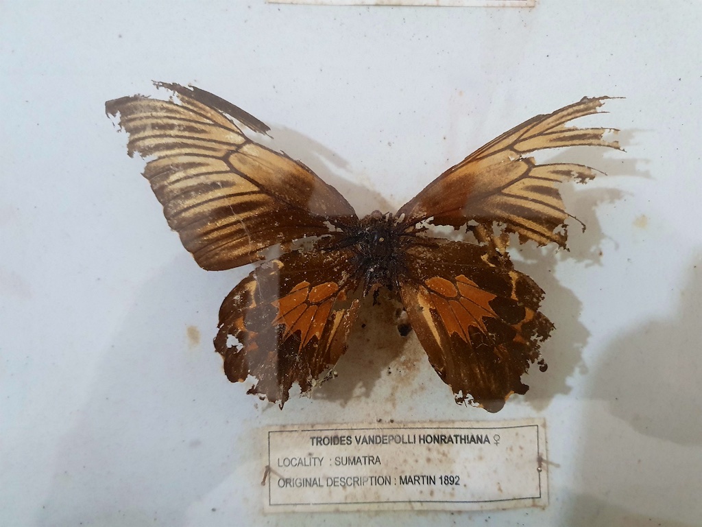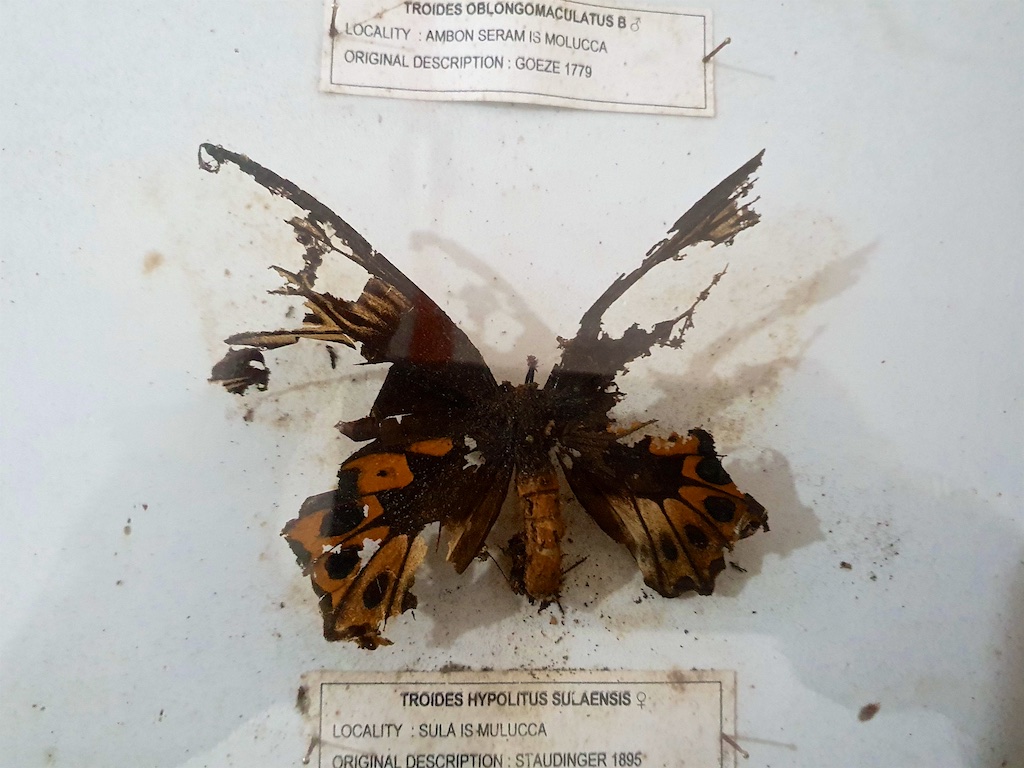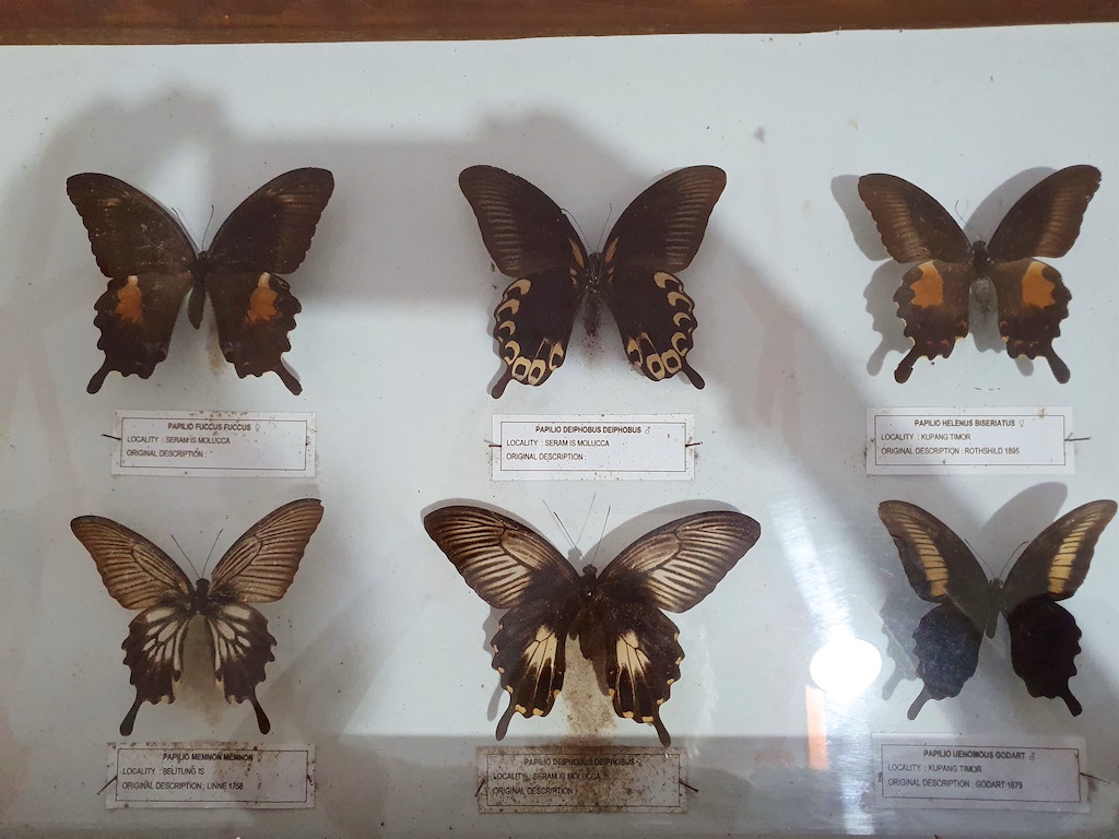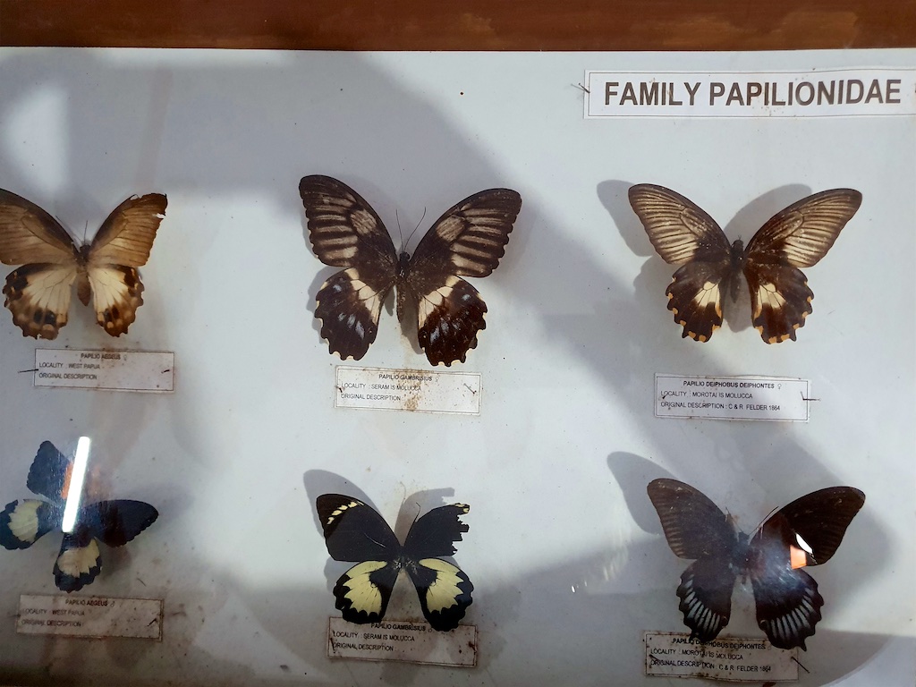 Le garde nous montre les collections du musée …aucune boite n’est protégée avec du créosote de hêtre donc tous ces pauvres papillons sont dans un état désastreux …lorsque j’insiste auprès du garde pour l’achat de ce conservateur, il me répond que c’est impossible car c’est trop cher !!!