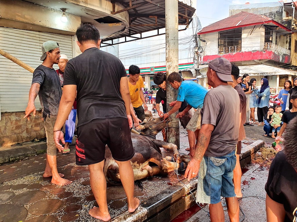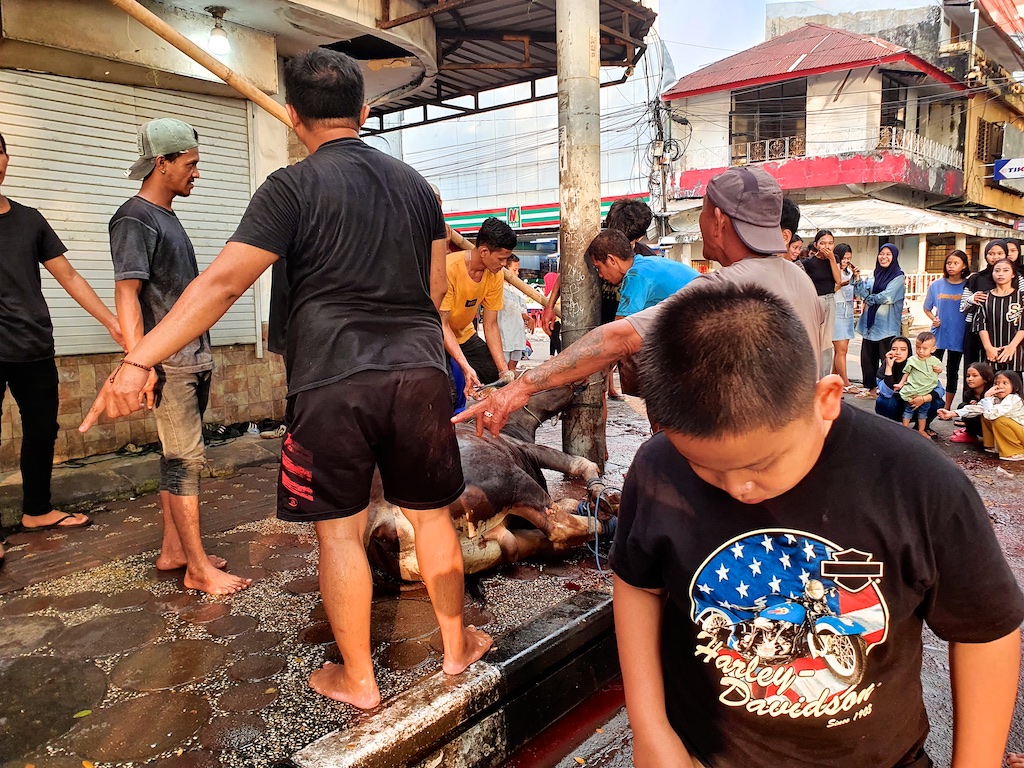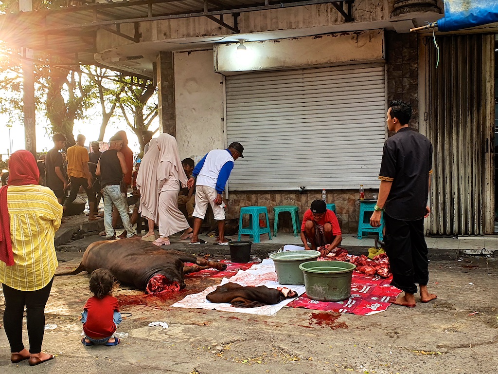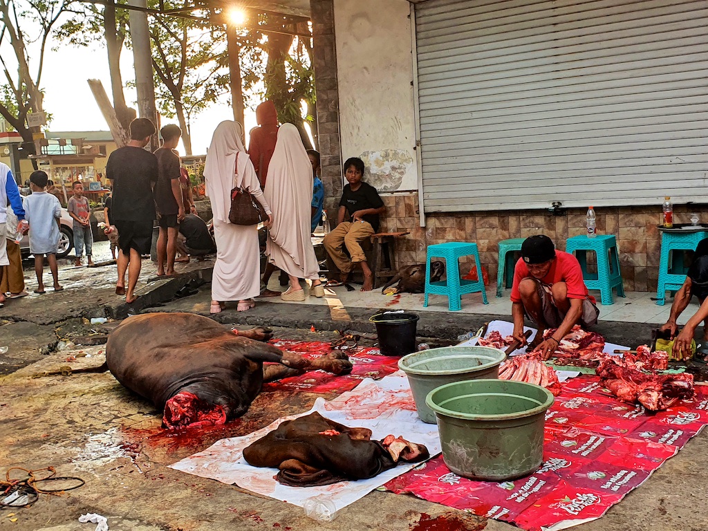 Pour la fête musulmane de Idul Adah, les musulmans sont autorisés à tuer les animaux dans la rue …particulièrement dégoutant !!! Le respect de la vie animale et l’hygiène alimentaire ne sont pas dans les habitudes du pays !!!