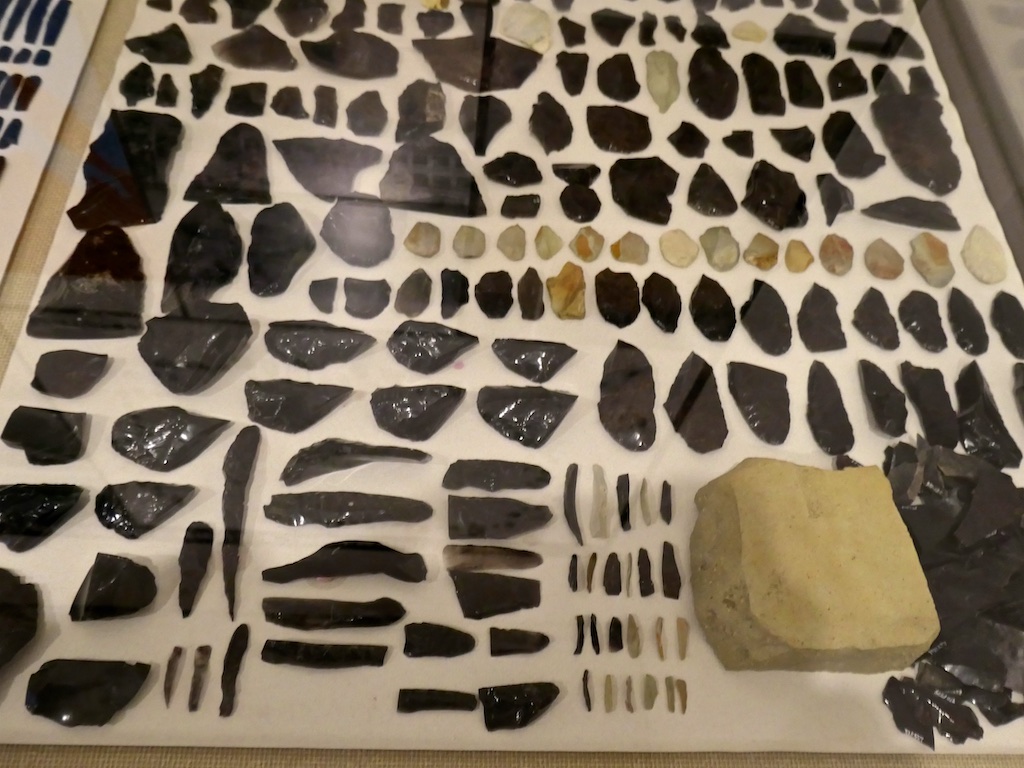 Des outils en pierre étaient utilisés, principalement des outils en pierre taillée , faits de schiste siliceux , mais aussi d’obsidienne et d’autres pierres. Ces types d’outils comprenaient, sans s’y limiter : des pointes de lance , des pointes de flèche , des grattoirs (à soie, à tige ou non), des outils plats semi-circulaires en pierre taillée (qui auraient servi à préparer des aliments végétaux), des couteaux et des forets en pierre .