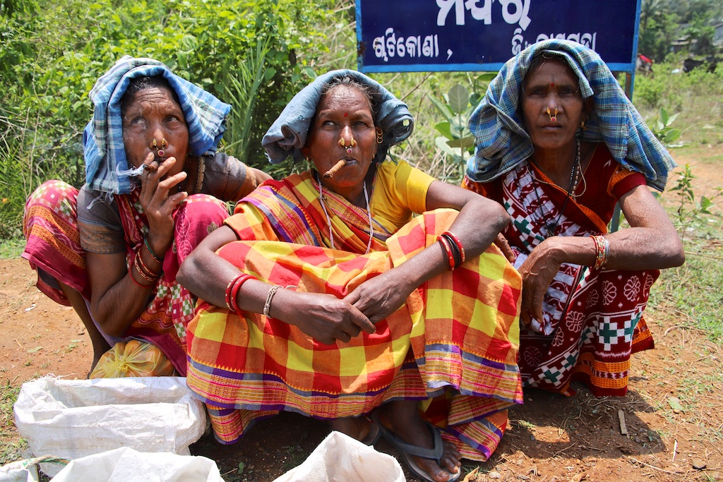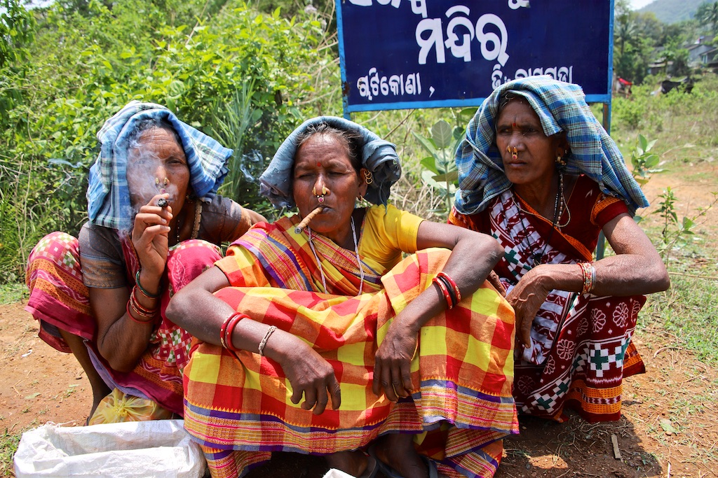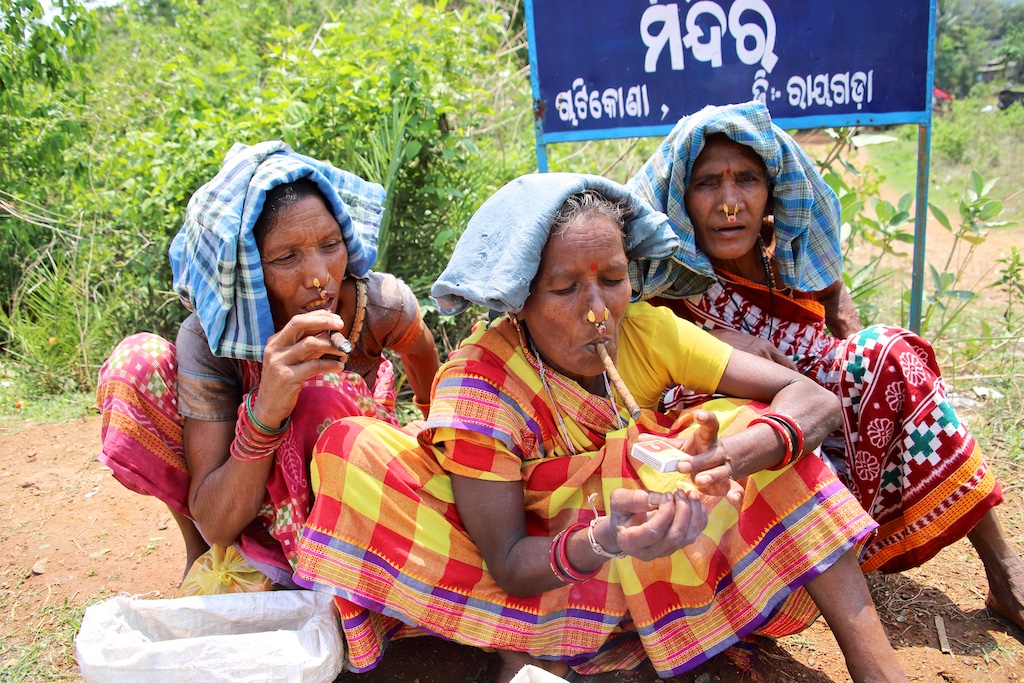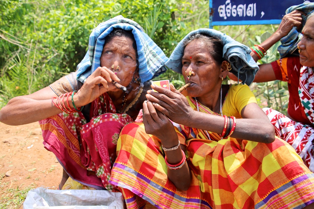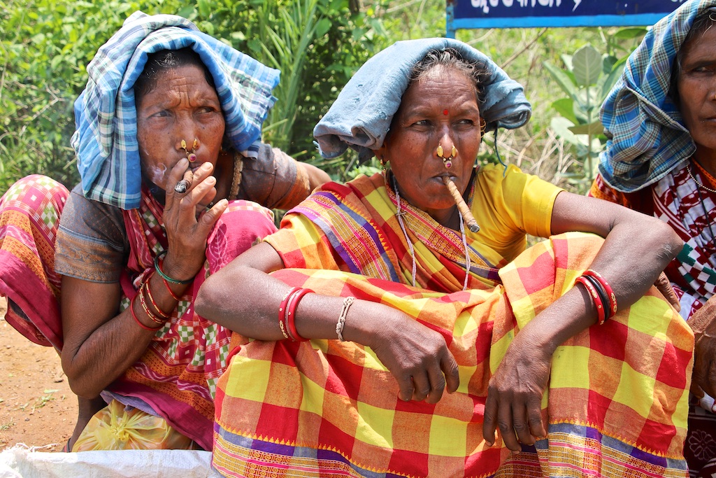 Dans le marché nous rencontrons une bande de femmes super sympas qui sont uniquement Kondh …elles fument des cigares qu’elles fabriquent elles mêmes avec du tabas qu’elles font pousser dans leur champs …ce qui est incroyable est qu’elles fument le cigare avec le bout allumé à l’intérieur de la bouche !!! Elles me font une démonstration mais ce n’est pas trop clair sur les photos !!