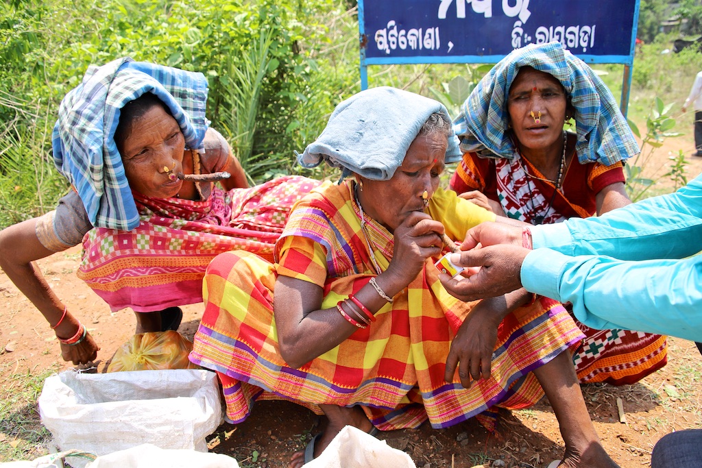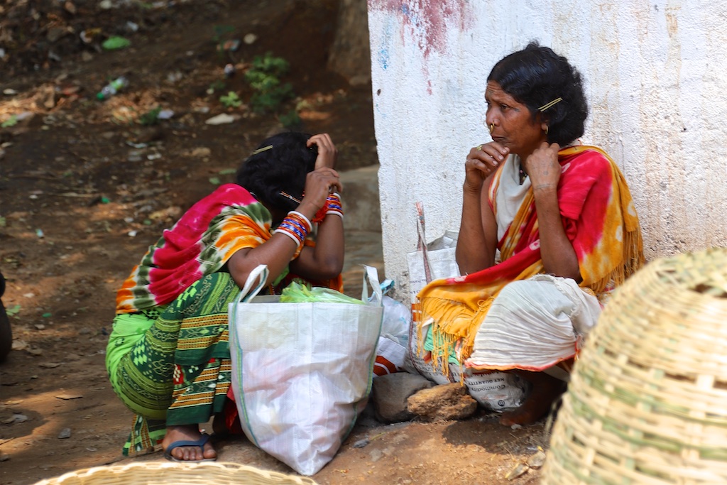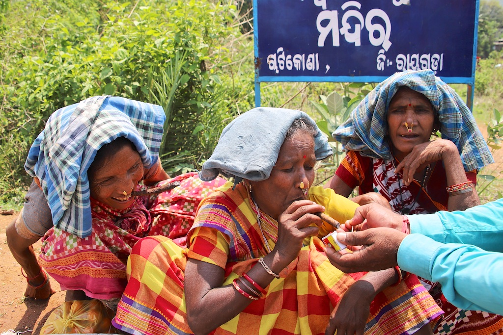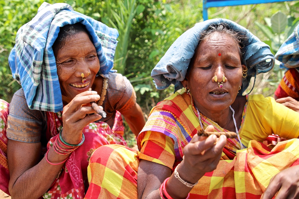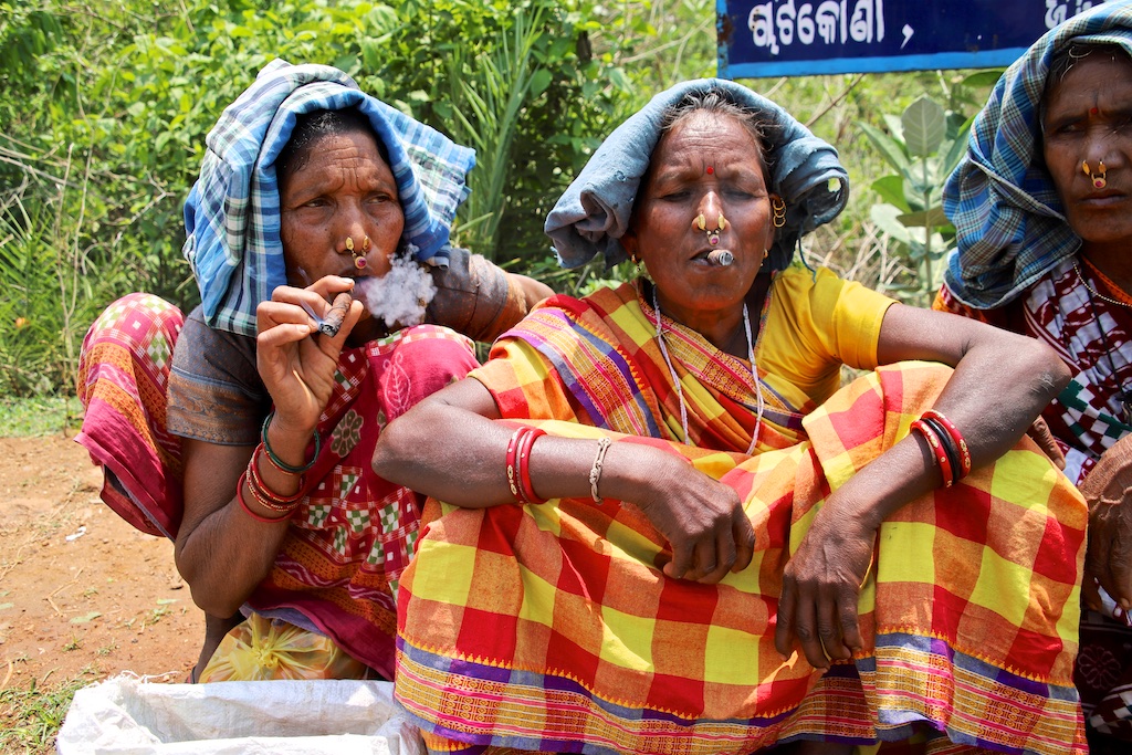 Dans le marché nous rencontrons une bande de femmes super sympas qui sont uniquement Kondh …elles fument des cigares qu’elles fabriquent elles mêmes avec du tabas qu’elles font pousser dans leur champs …ce qui est incroyable est qu’elles fument le cigare avec le bout allumé à l’intérieur de la bouche !!! Elles me font une démonstration mais ce n’est pas trop clair sur les photos !!