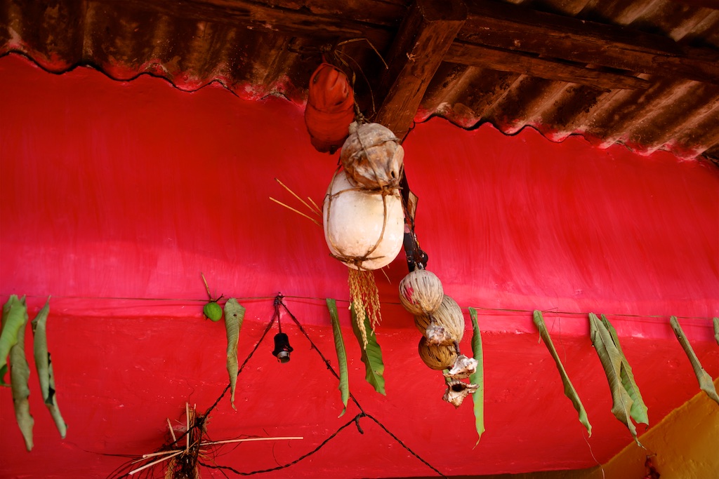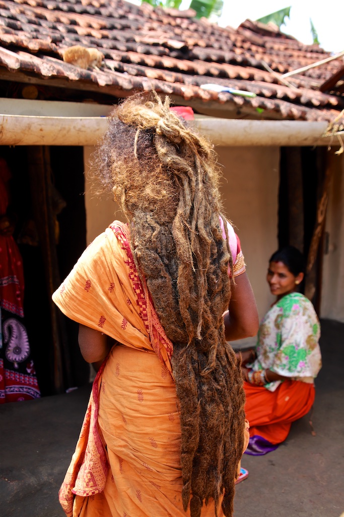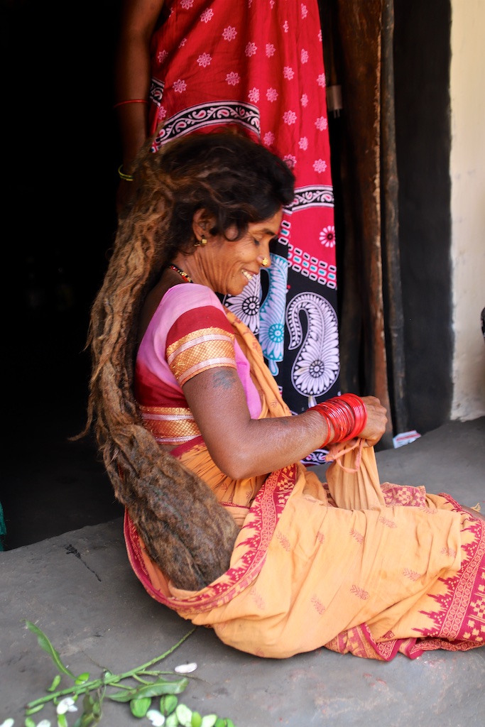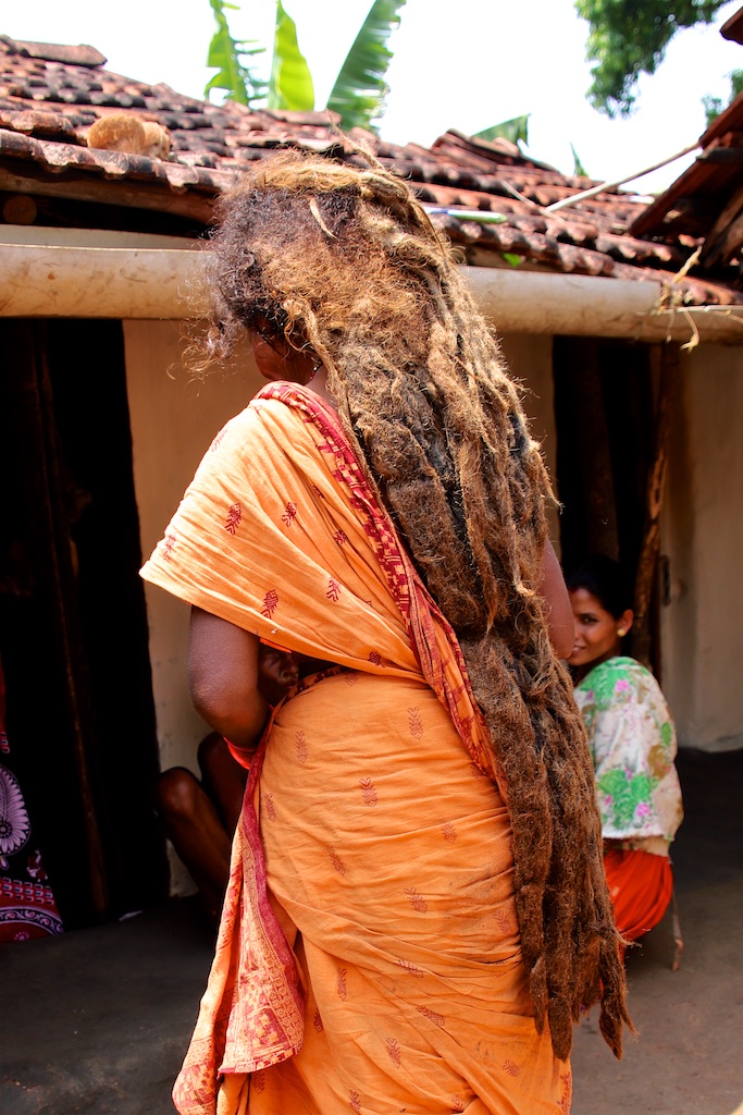 Une autre particularité de ce beau village Gadaba ..il possède une chaman relativement jeune …celle ci possède une chevelure impressionnante qu’a priori, elle n’a jamais peignée. La maison du chaman est coquette et peinte en rose : de nombreux objets et plantes sont suspendus à un fil au dessus de l’entrée afin d’éloigner les mauvais esprits.
