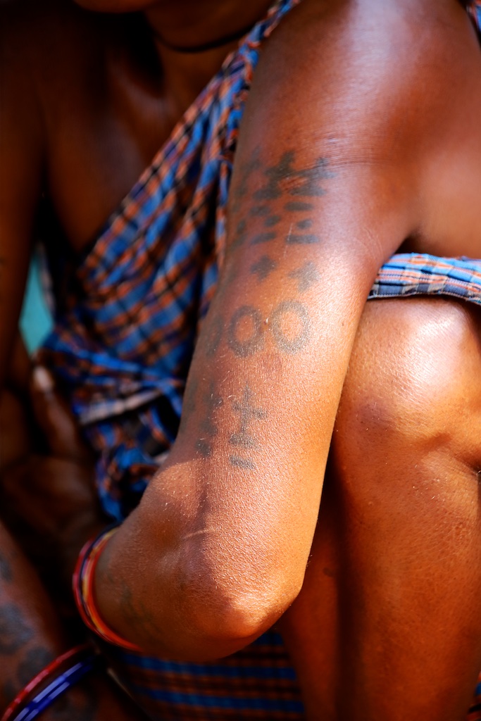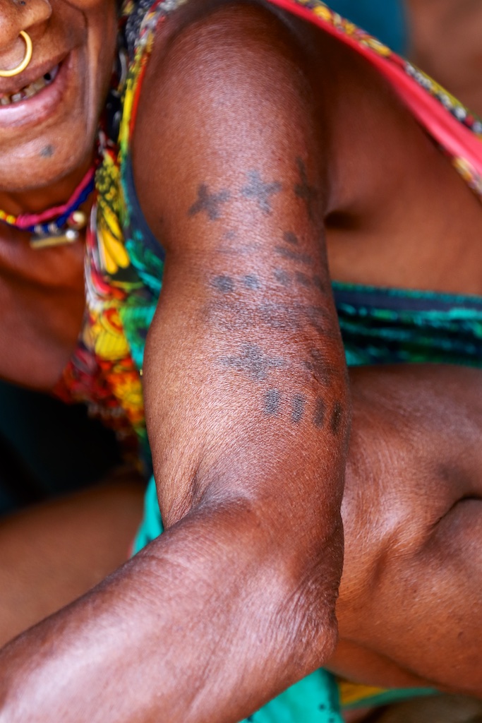 Les membres de la tribu portent des tatouages sur les mains et le front et de nombreuses boucles d’oreilles …les anneaux de nez sont générallement en or.