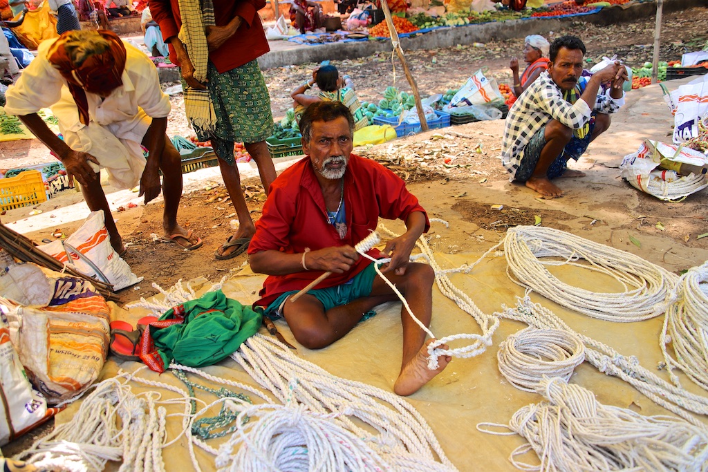 Sur la photo précédente cet homme fabrique des cordes à partir des fibres obtenues en « détricotant » les sacs en toile utilisés par les villageois pour transporter leurs courses …un énorme travail pour un tout petit bénéfice …