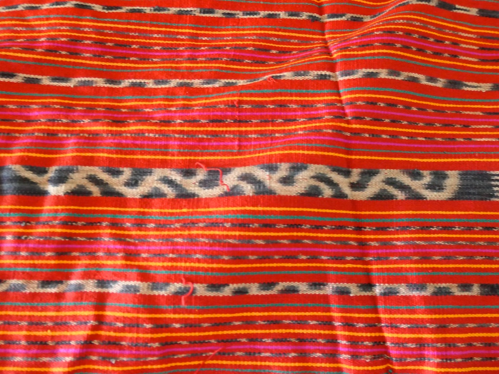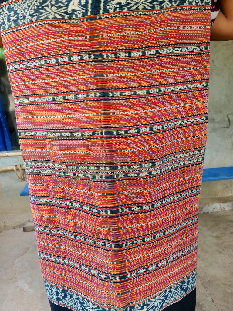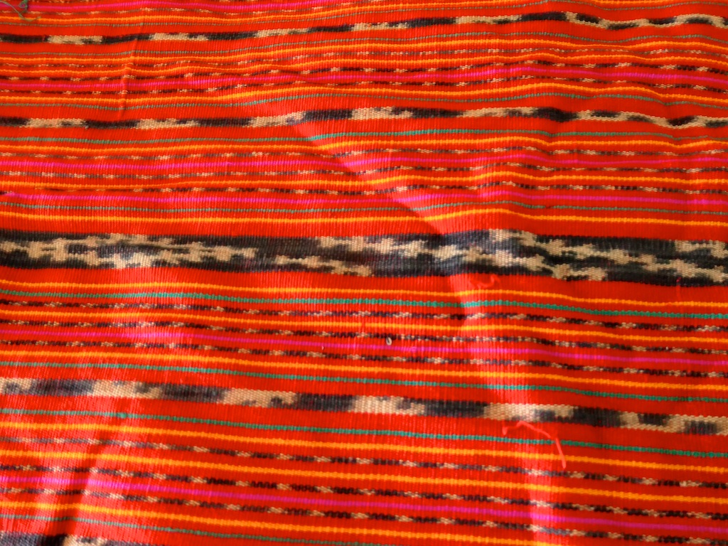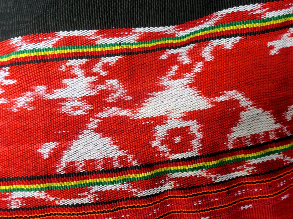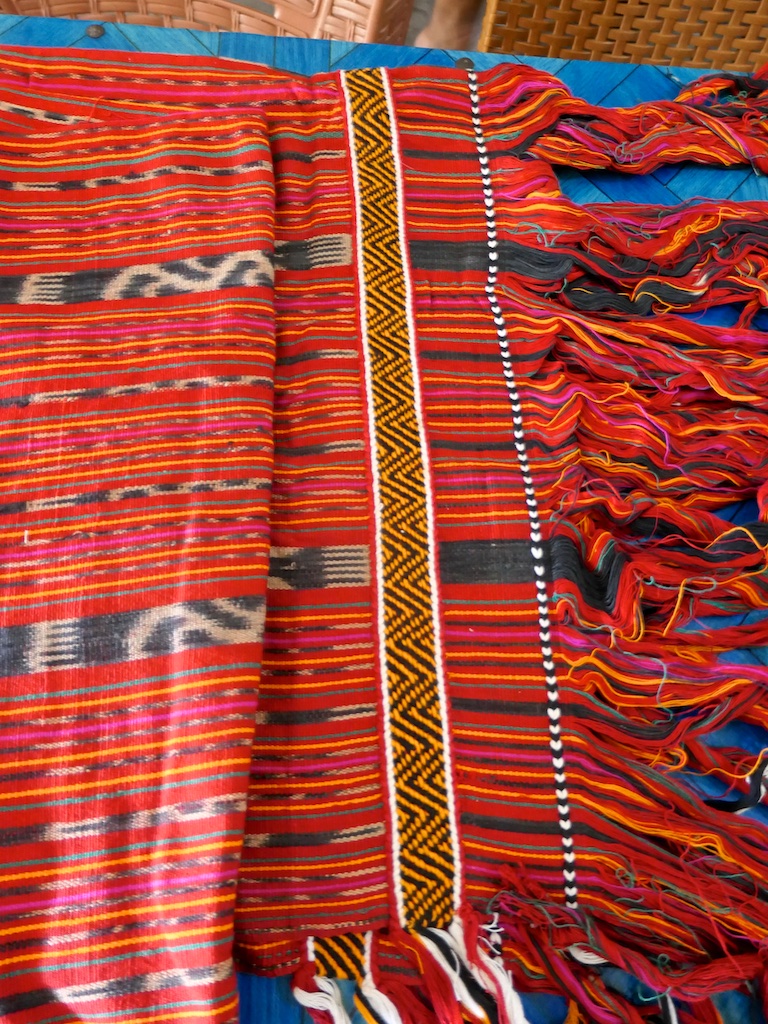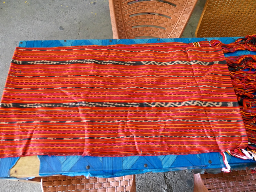 Toujours à Wetar avant le grand départ on trouve dans un des restaurants, un exemple de tissage dit « traditionnel » mais qui ne l’est pas vraiment …le coton est du marché et les couleurs sont synthétiques.