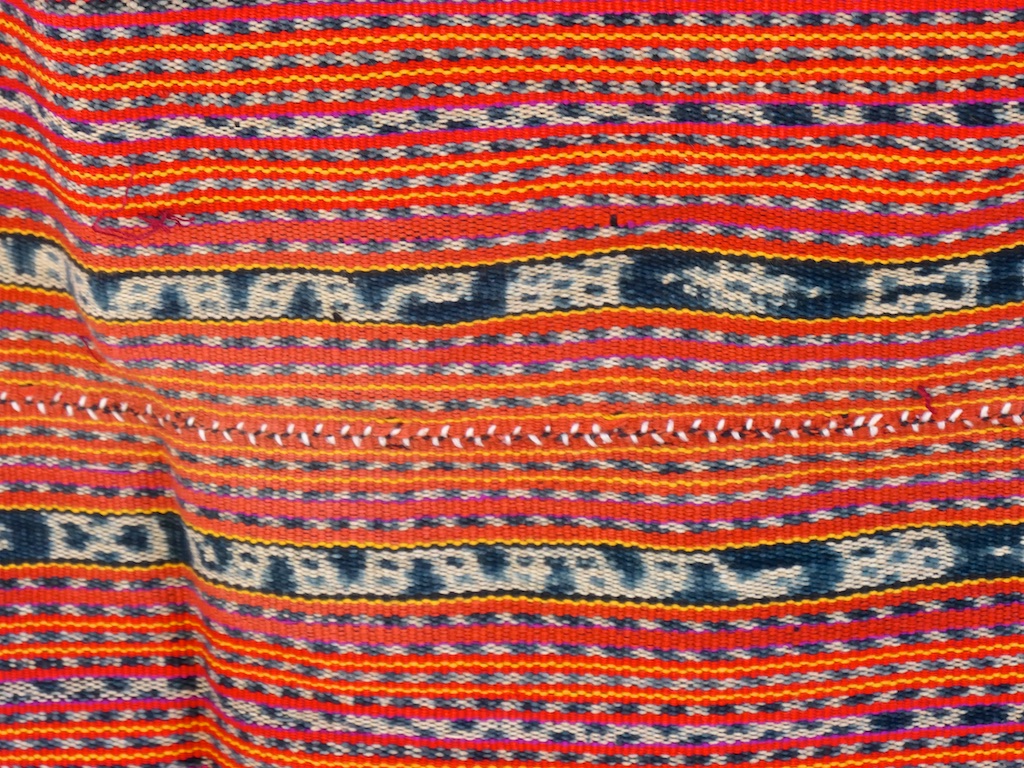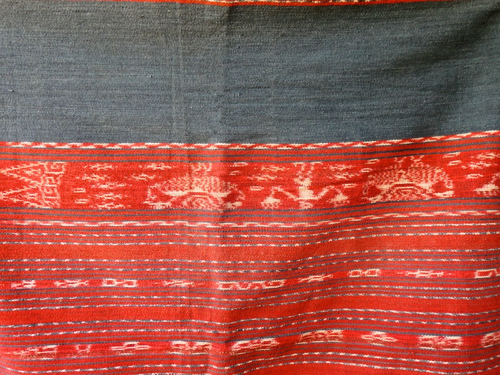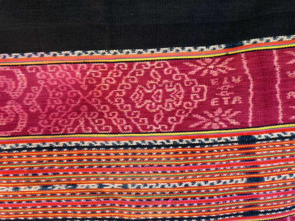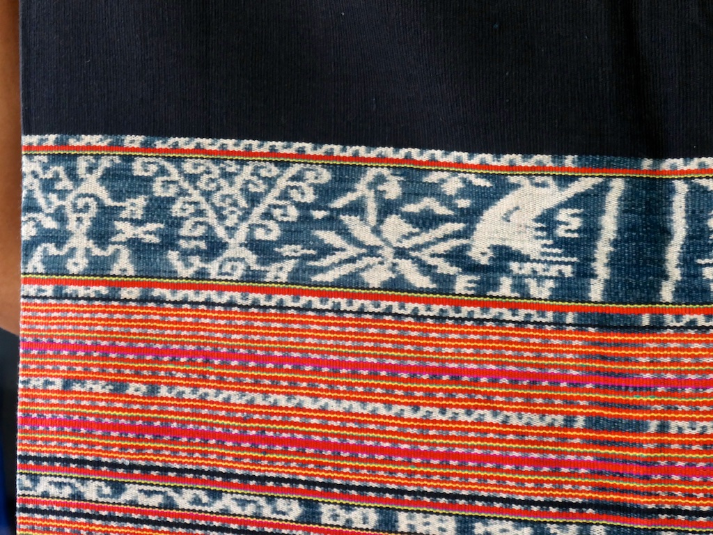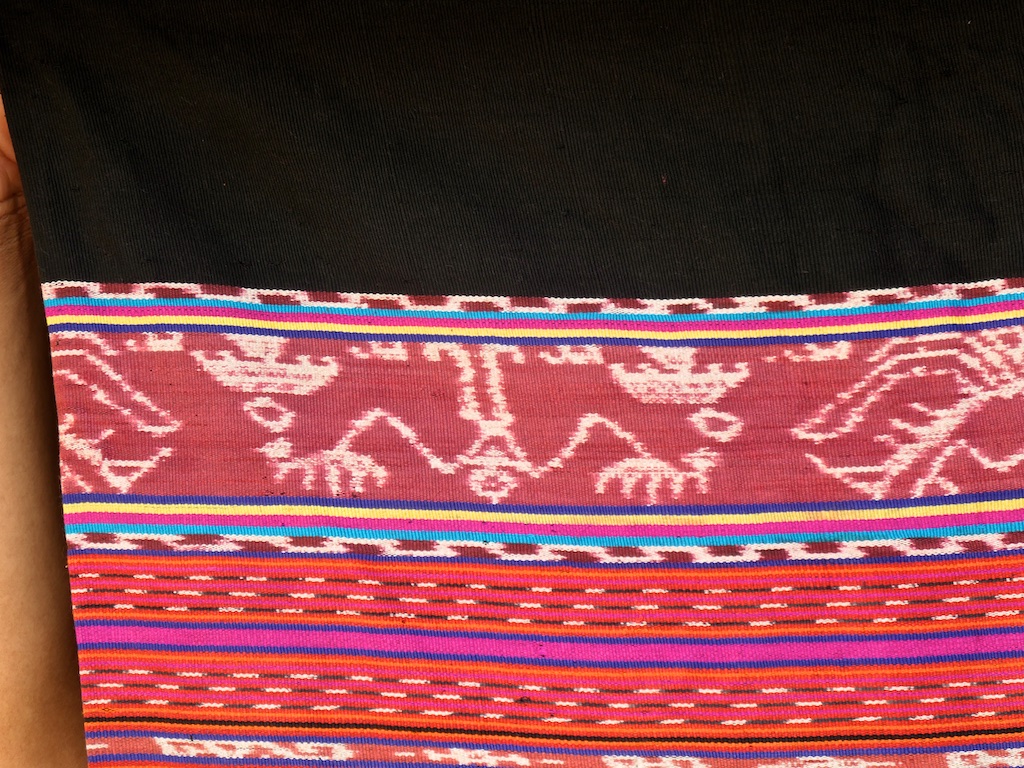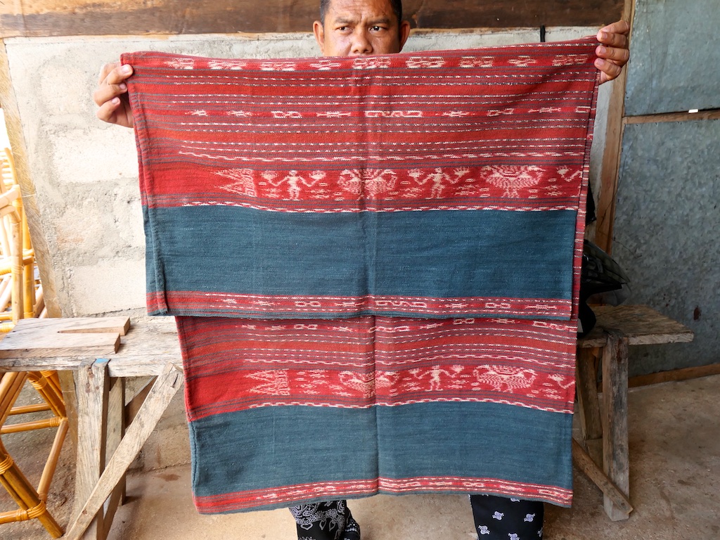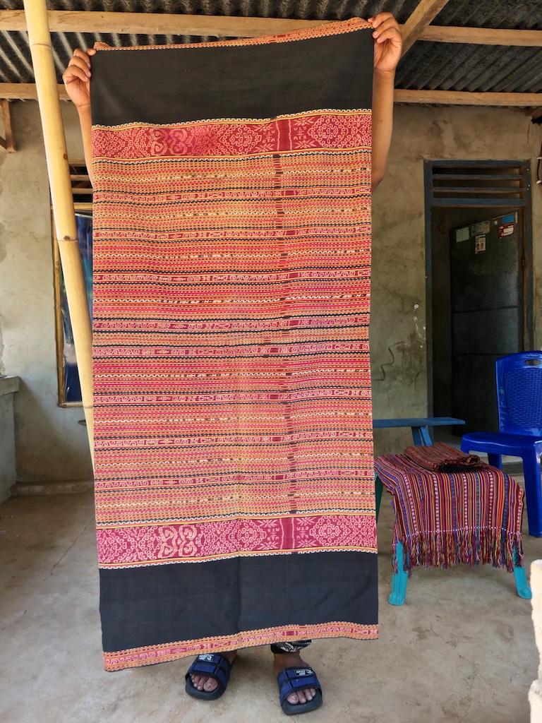 Toujours à Wetar avant le grand départ on trouve dans un des restaurants, un exemple de tissage dit « traditionnel » mais qui ne l’est pas vraiment …le coton est du marché et les couleurs sont synthétiques.