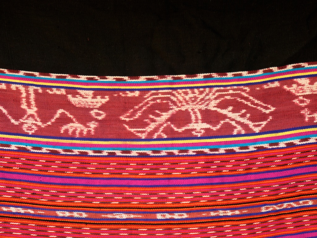 Les premiers dessins ikat ont peut-être été apportés à Kisar, au Timor oriental et peut-être dans d’autres parties des îles de la Sonde par une vague tardive d’immigrants austronésiens du sud de Sulawesi. Ils ne semblent être arrivés qu’il y a environ un millier d’années, avant cela les habitants de cette région parlaient seulement des dialectes du papuan (Hull 1998,149-53). Ils ont introduit un nouveau style de tubeskirt à deux panneaux, avec un centre étroit rayé en chaîne entouré d’une paire de larges bandes ikat en chaîne composées de motifs carrés, terminées à chaque extrémité par de larges bandes noires unies.