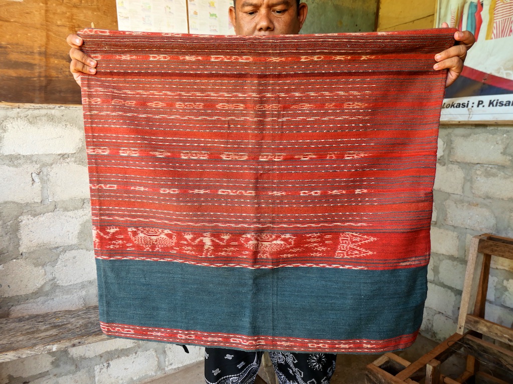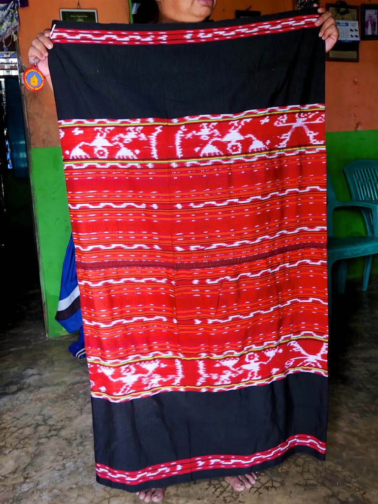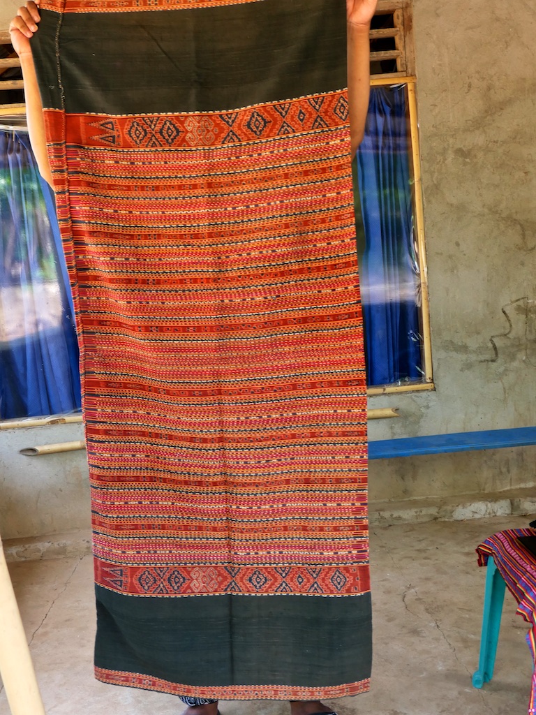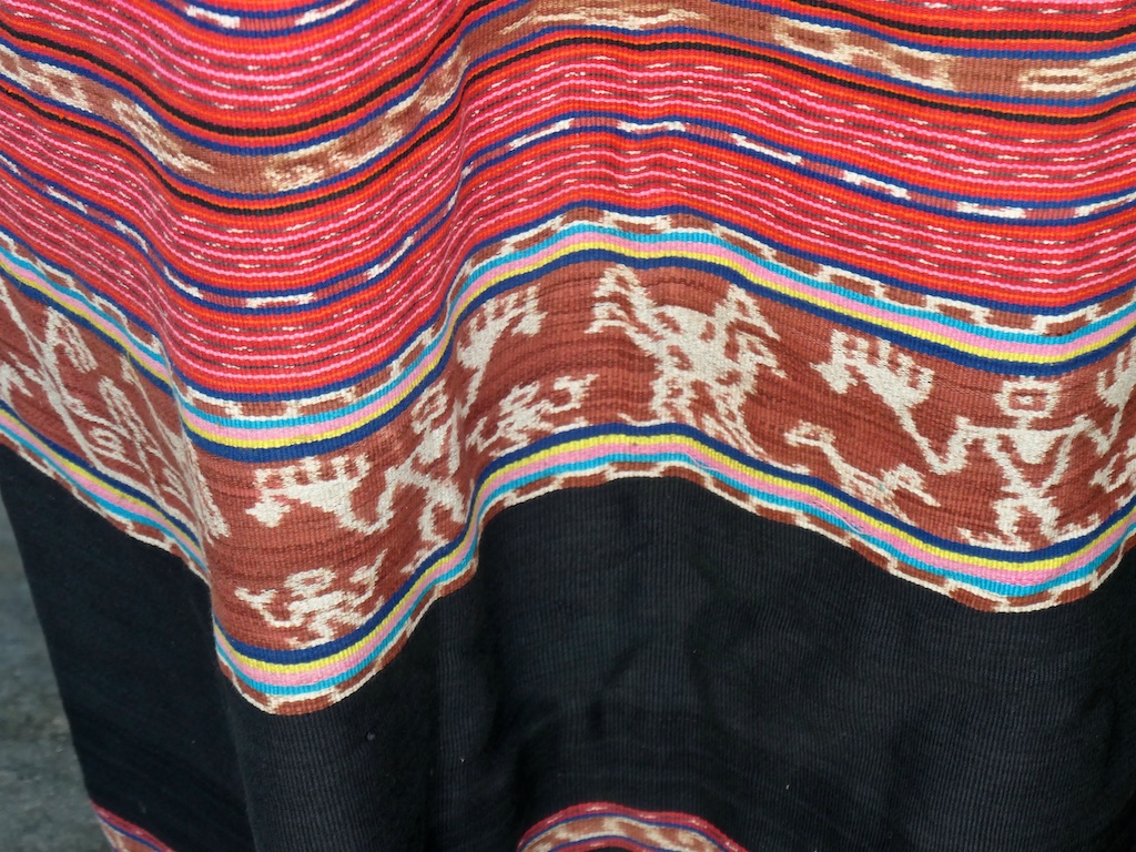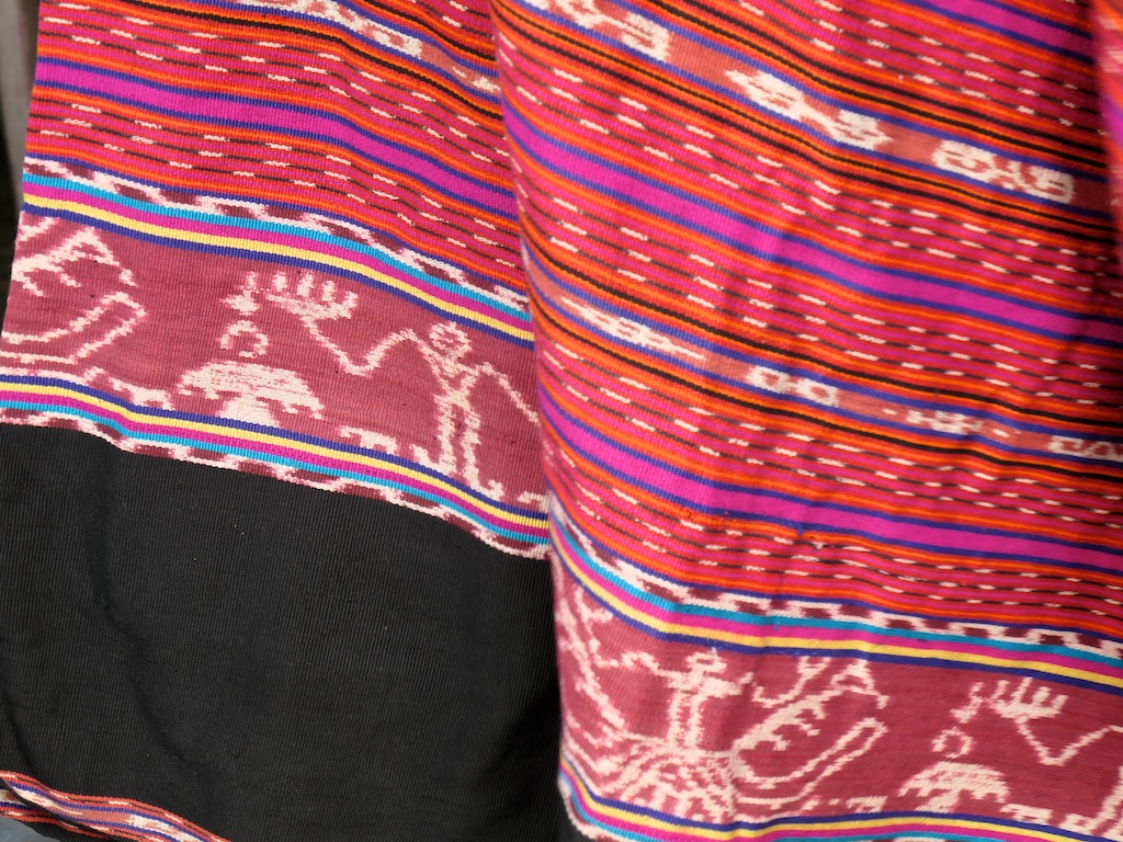 Toujours à Wetar avant le grand départ on trouve dans un des restaurants, un exemple de tissage dit « traditionnel » mais qui ne l’est pas vraiment …le coton est du marché et les couleurs sont synthétiques.