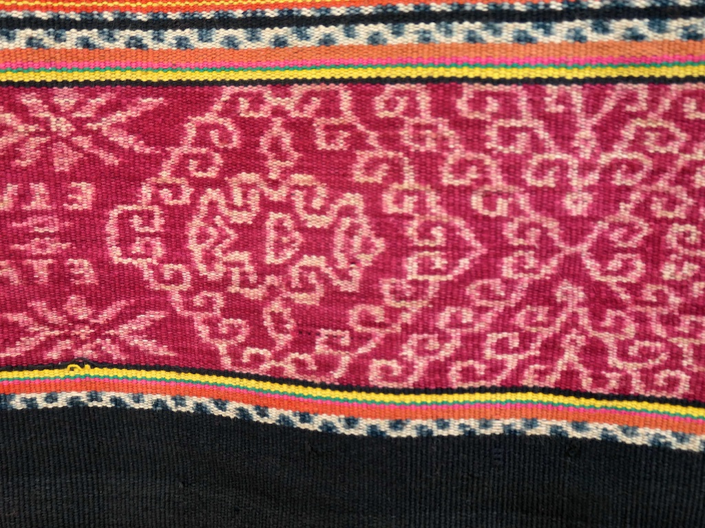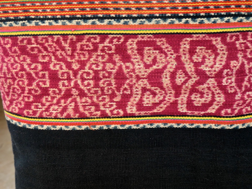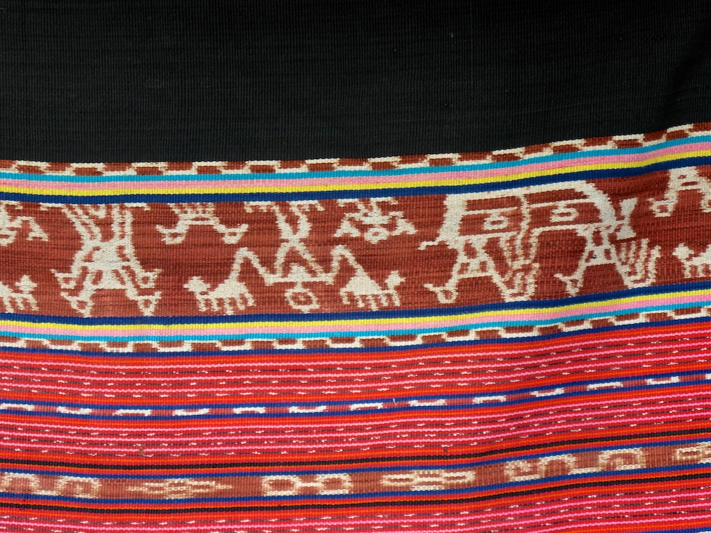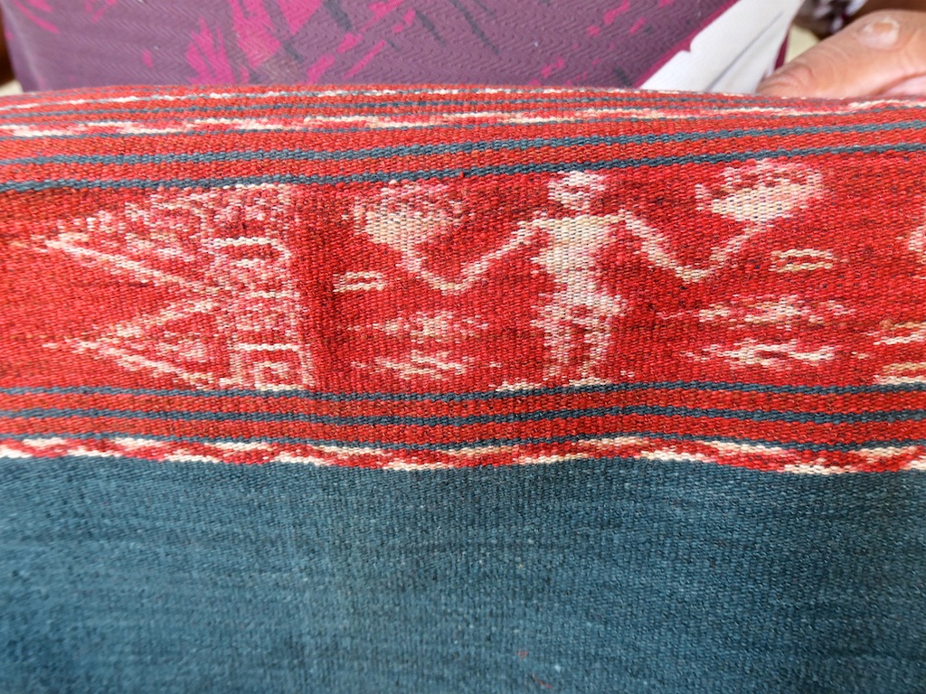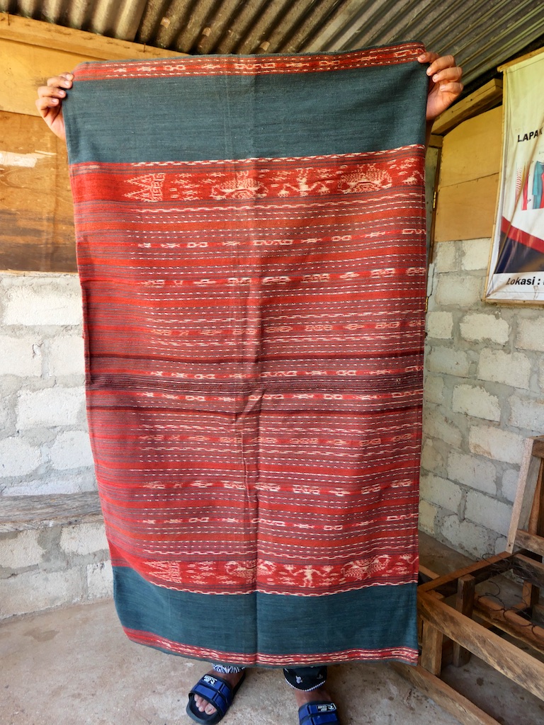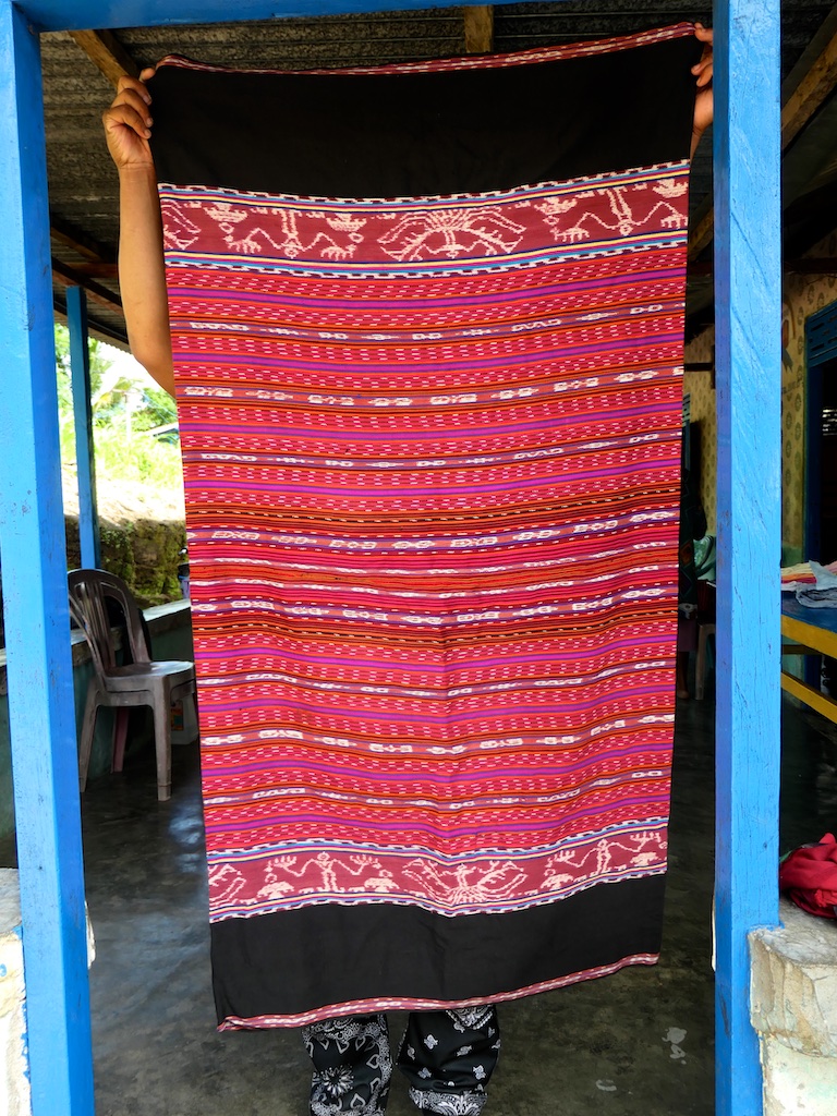 Toujours à Wetar avant le grand départ on trouve dans un des restaurants, un exemple de tissage dit « traditionnel » mais qui ne l’est pas vraiment …le coton est du marché et les couleurs sont synthétiques.
