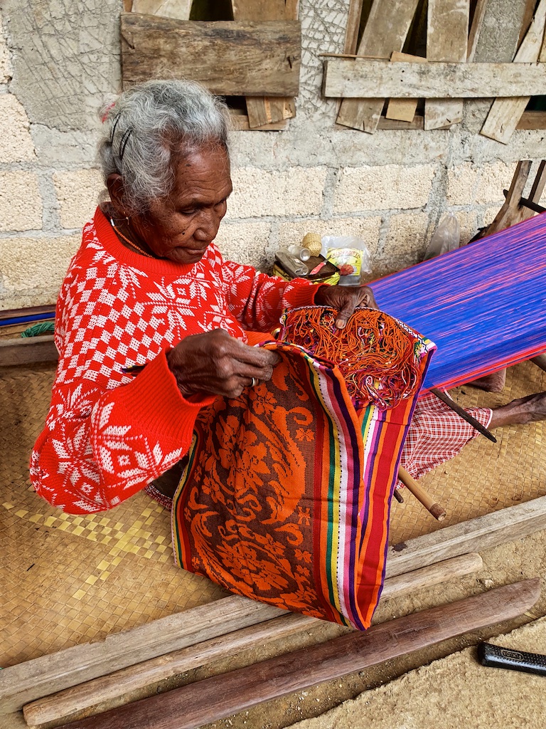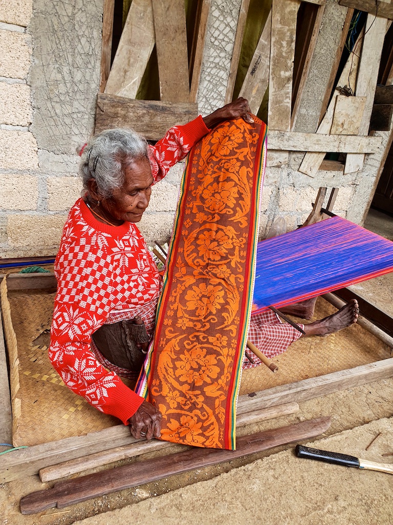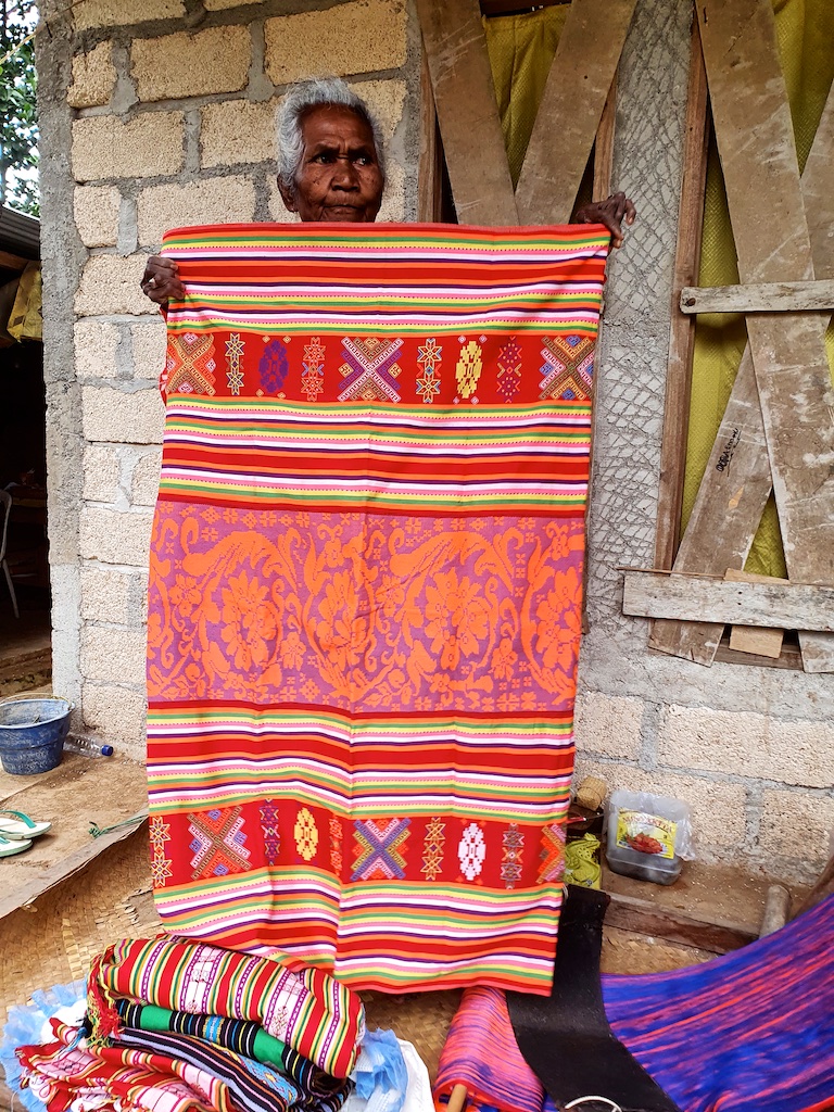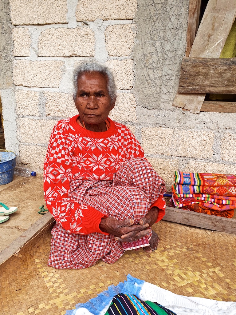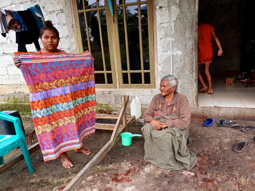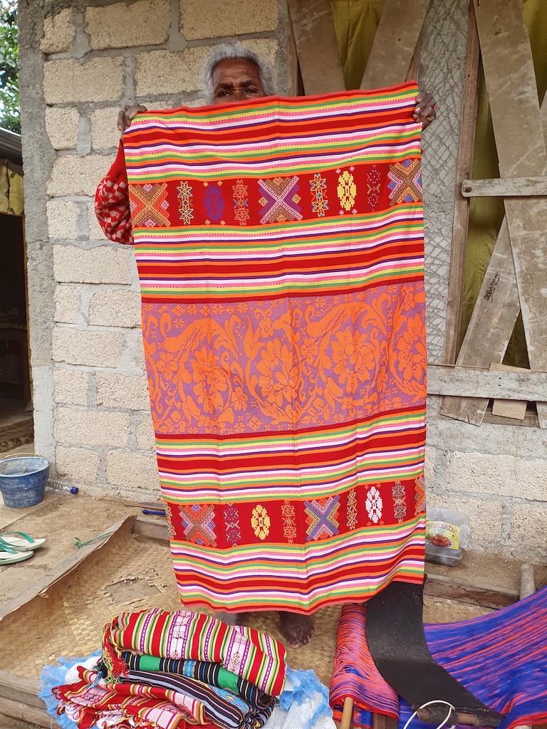 Prochaine étape toujours à Eban avec une vieille dame …visiblement les jeunes ne s’intéressent pas à ce type d’ouvrages..Elle détient un magnifique sarong Buna …mais j’ai presque le même !!!
