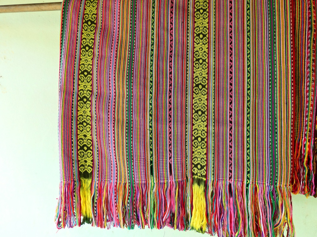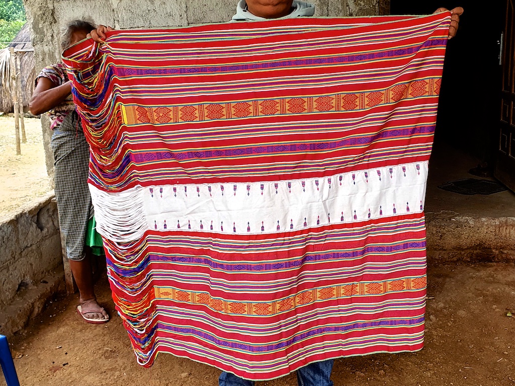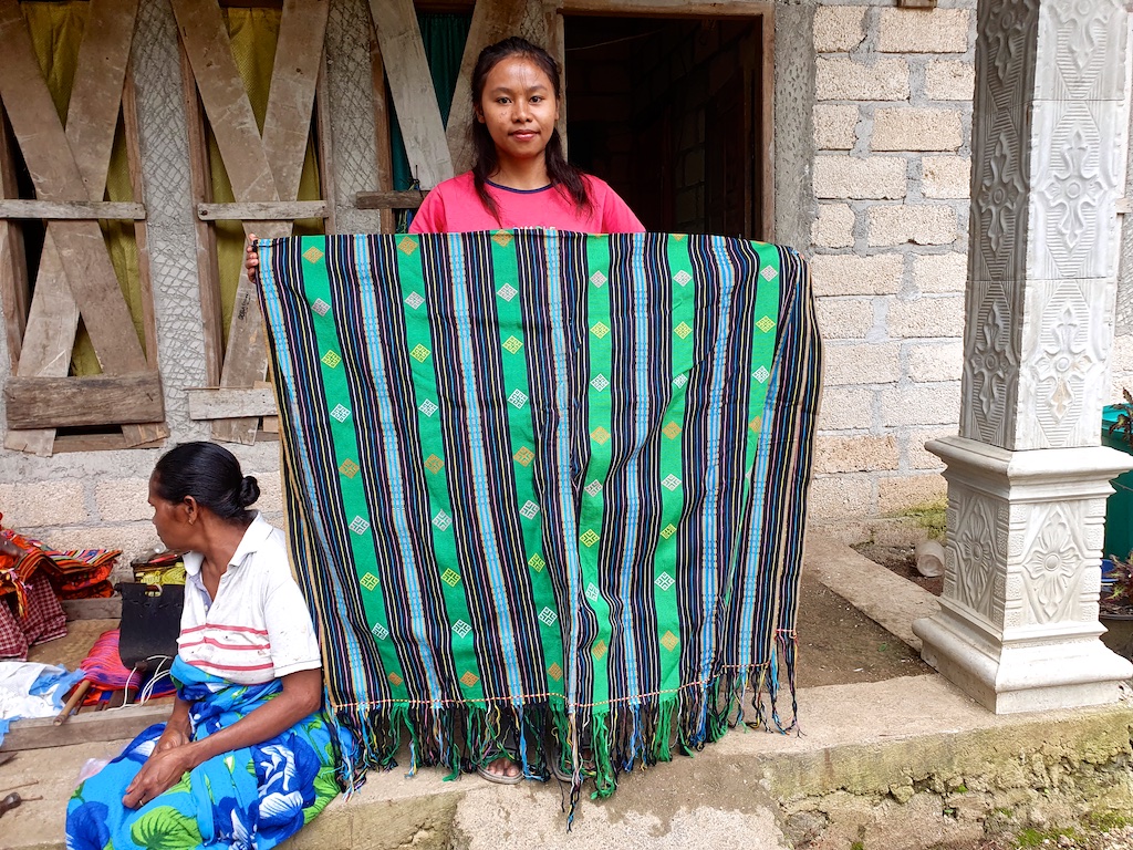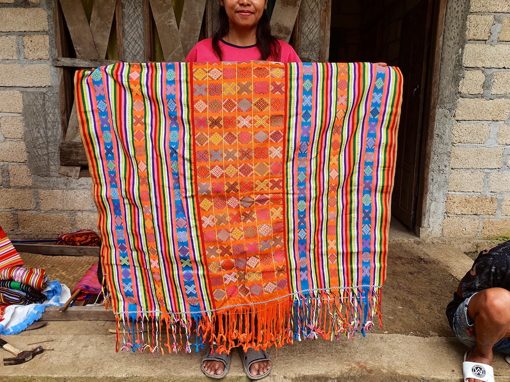 On s’arrête souvent mais on ne voit pas de tissages très intéressants avant d’arriver à Eban …là on rencontre une vieille dame en train de préparer son métier à tisser …elle se fait tirer un peu l’oreille avant de nous montrer ses chefs d’oeuvre …mais on insiste et cela valait la peine !!!
