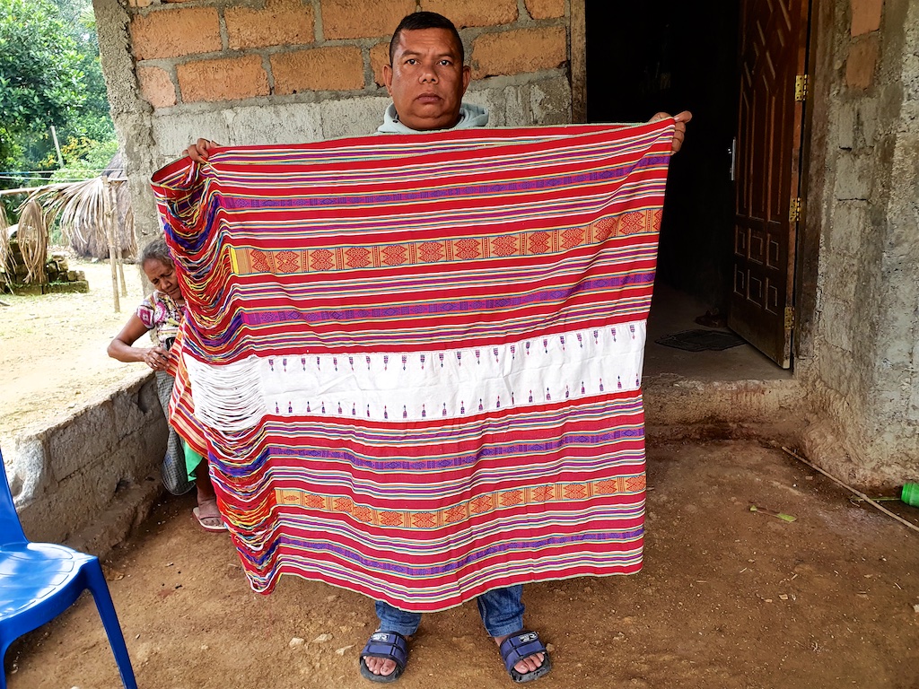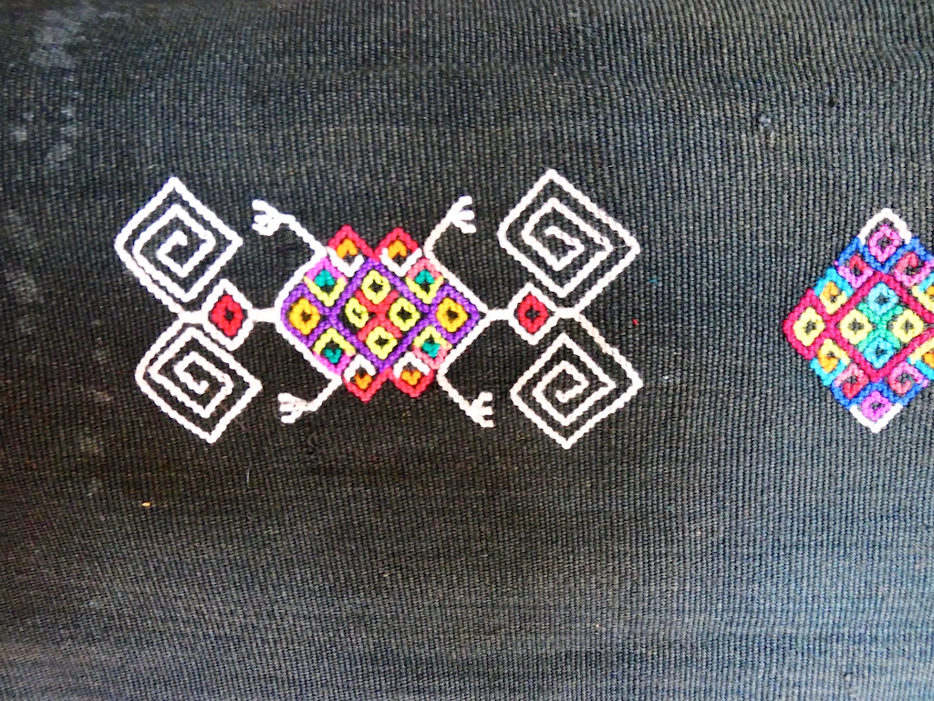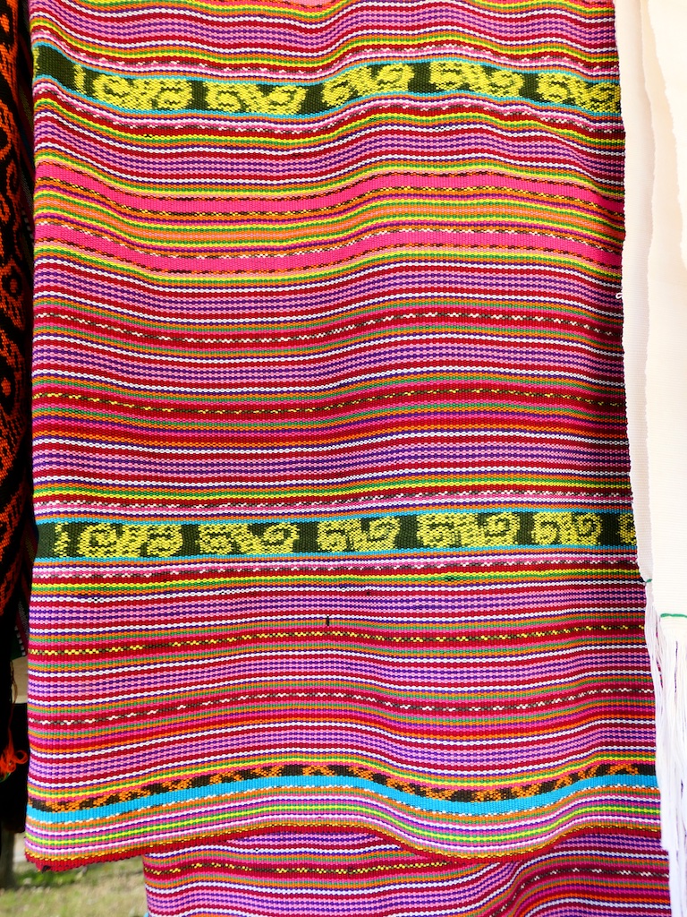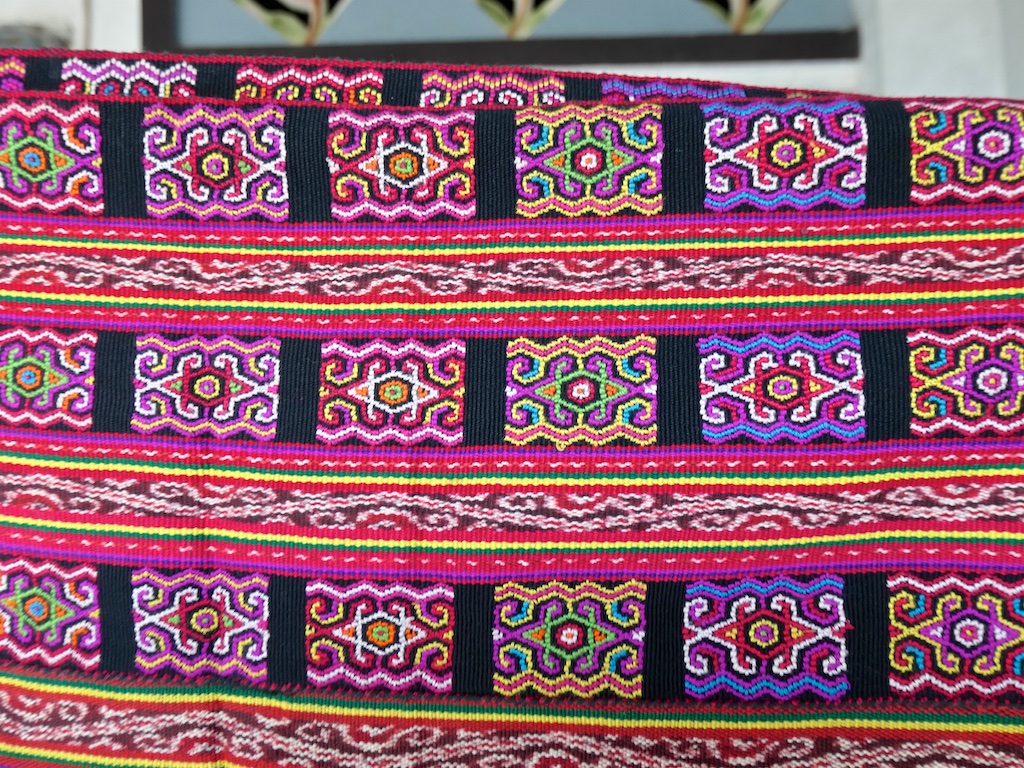 On s’arrête souvent mais on ne voit pas de tissages très intéressants avant d’arriver à Eban …là on rencontre une vieille dame en train de préparer son métier à tisser …elle se fait tirer un peu l’oreille avant de nous montrer ses chefs d’oeuvre …mais on insiste et cela valait la peine !!!