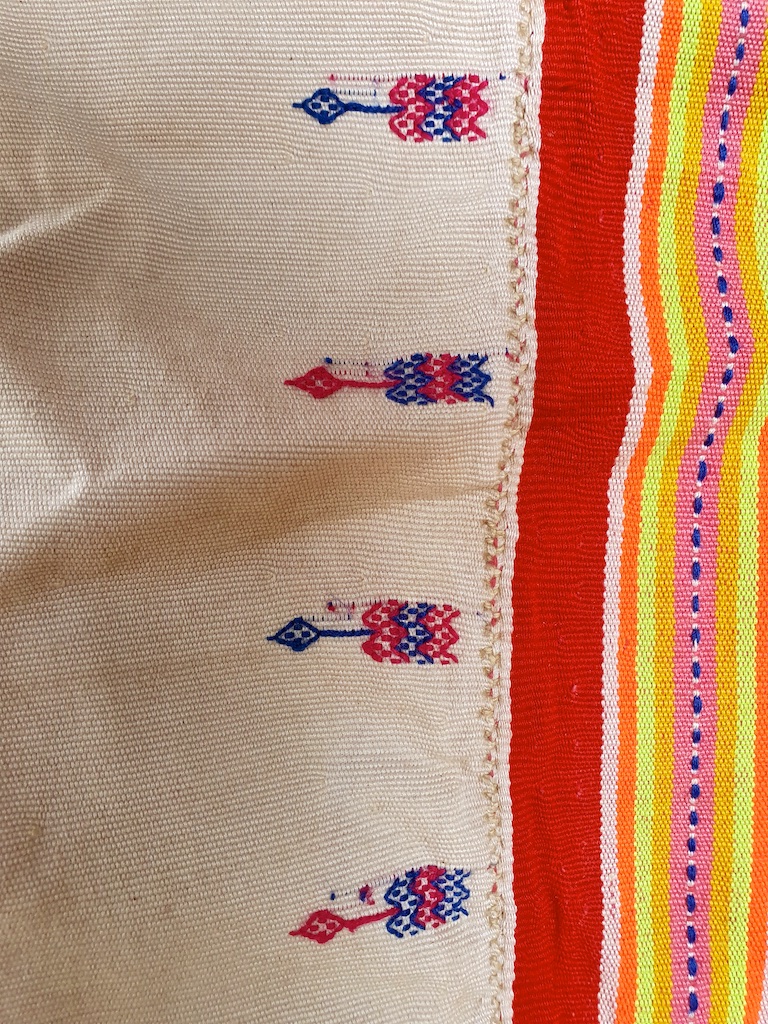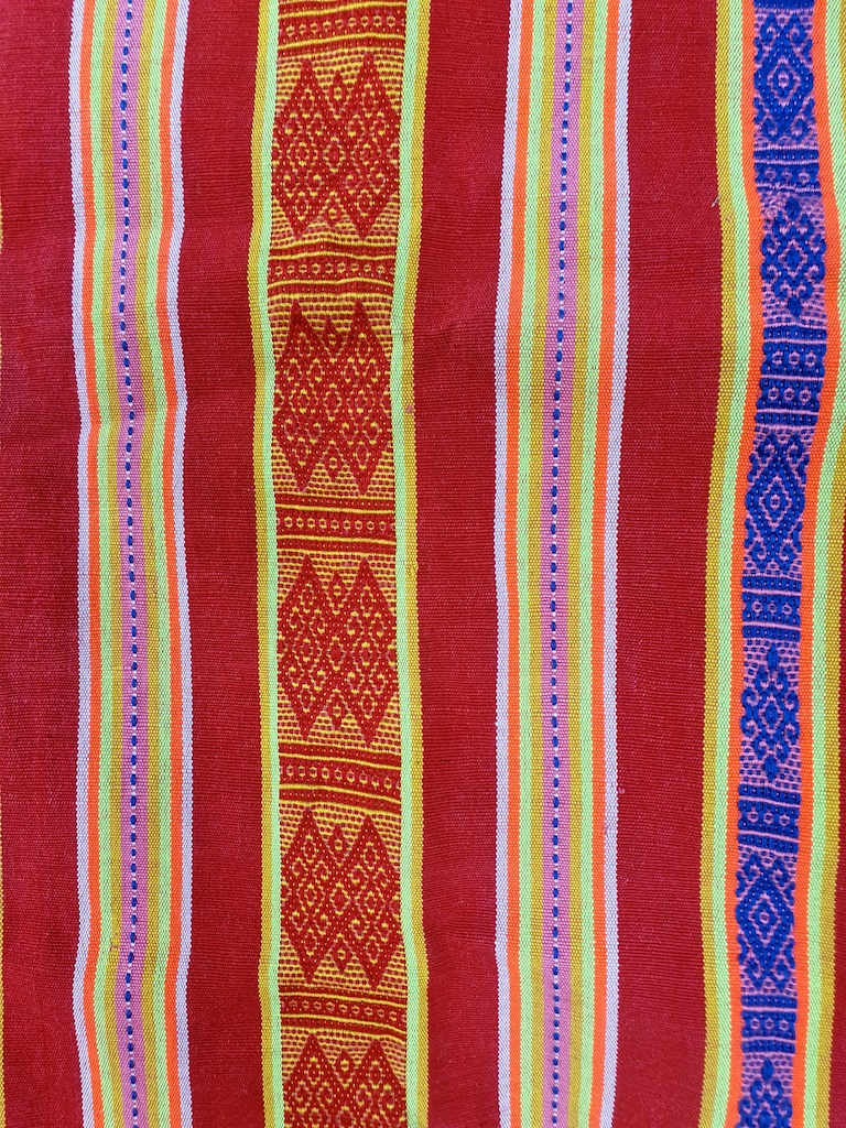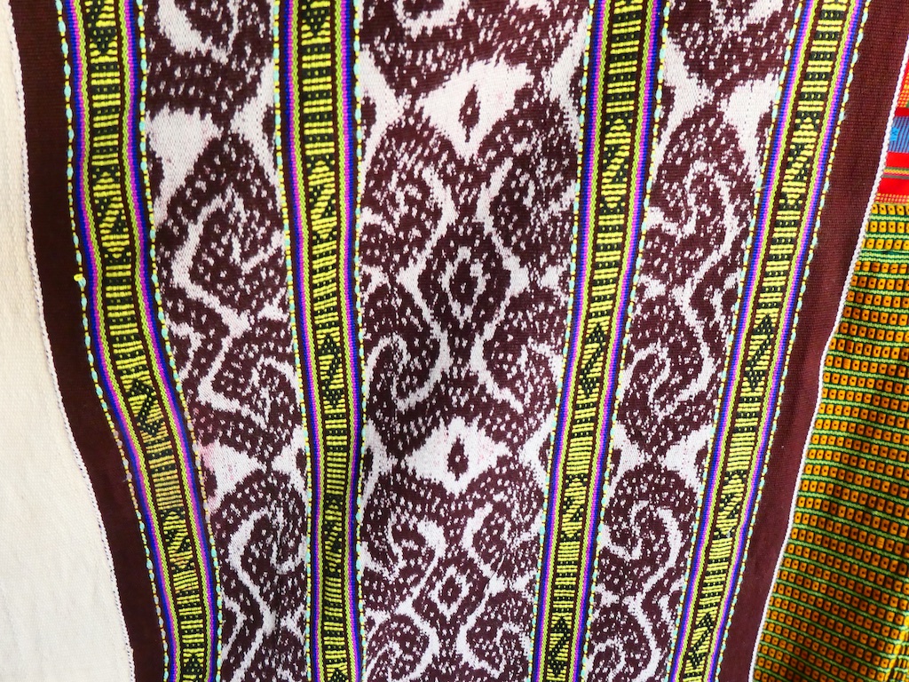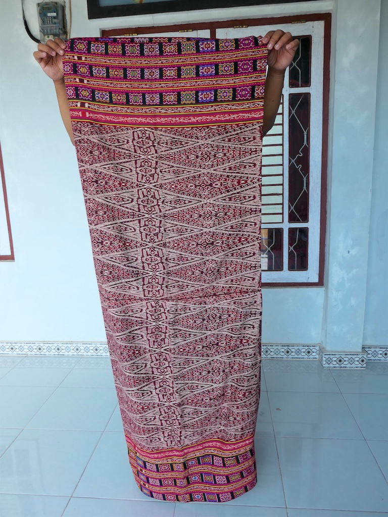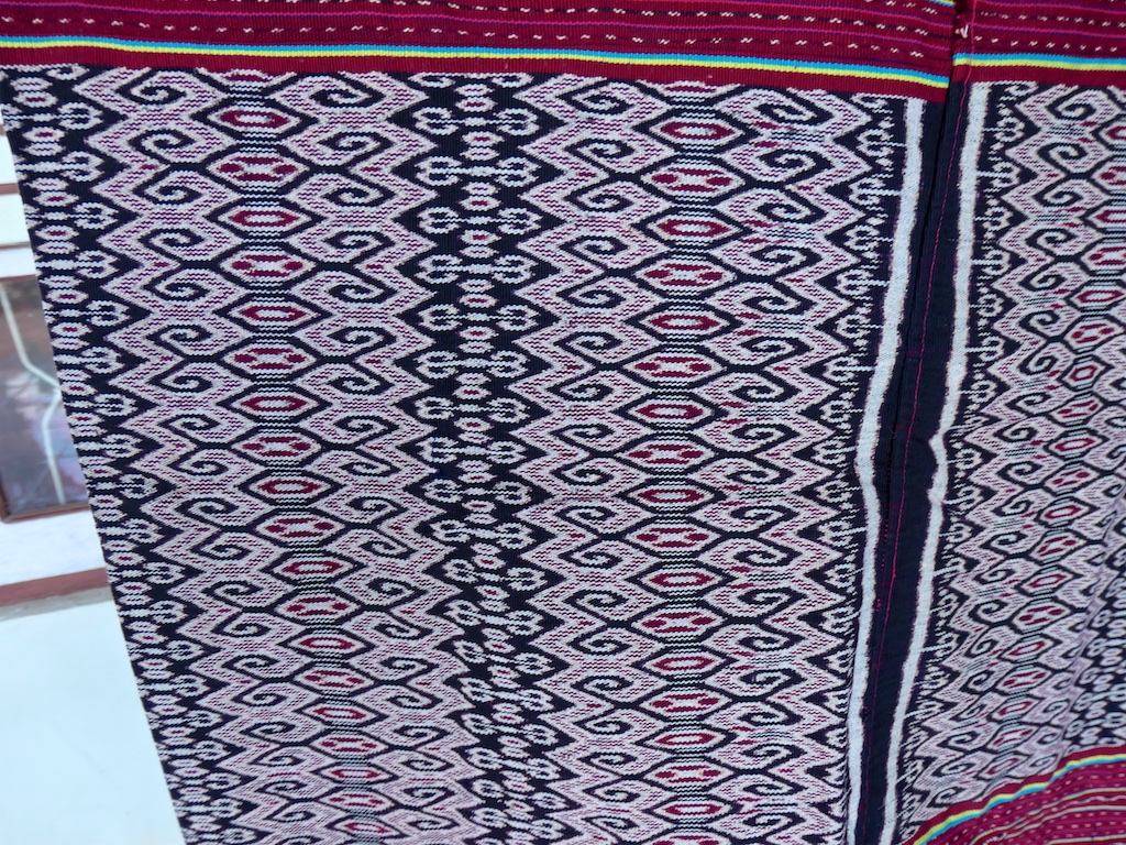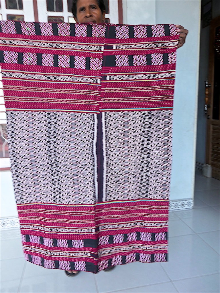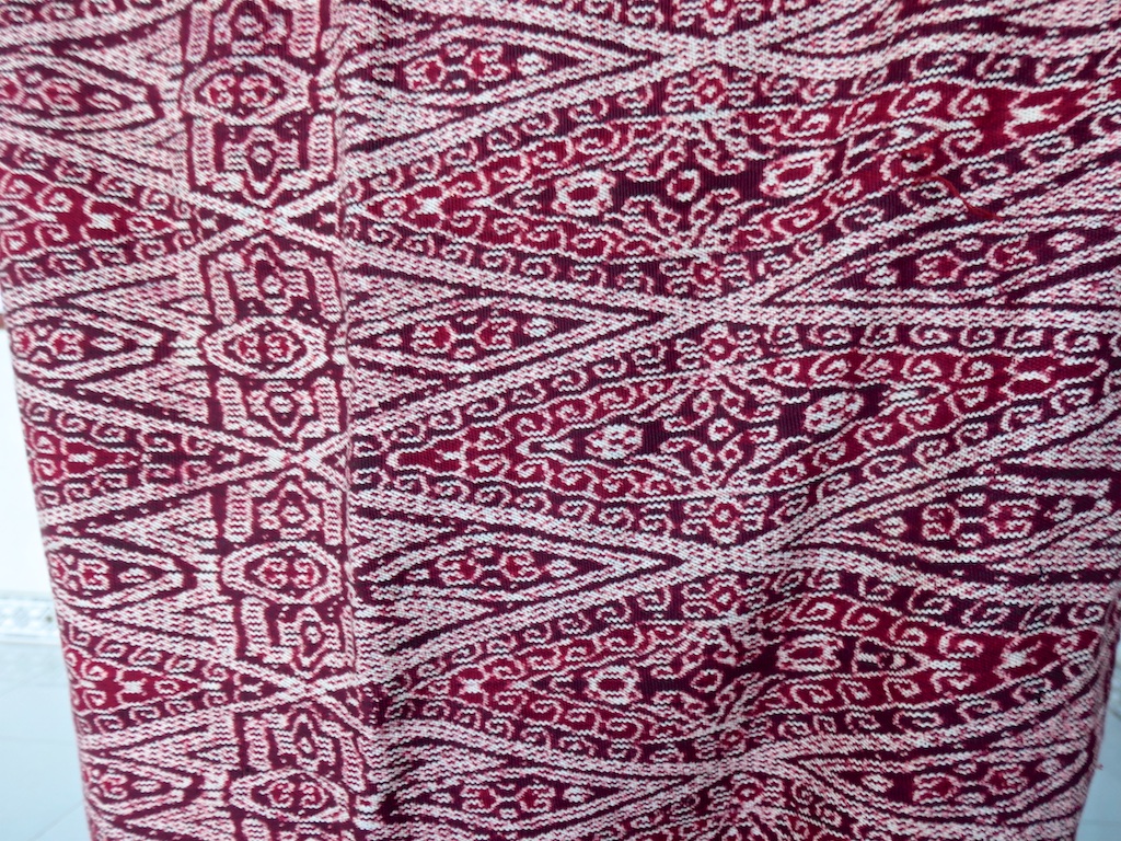 Arrivés sur place je découvre le sarong de mes rêves avec les caractéristiques souhaitées : magnifique partie au centre avec un beau motif ikat, 3 bandes de motifs buna en haut et en bas soit un ouvrage de qualité supérieure…
