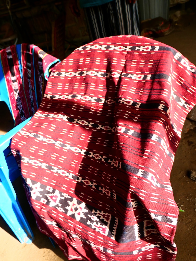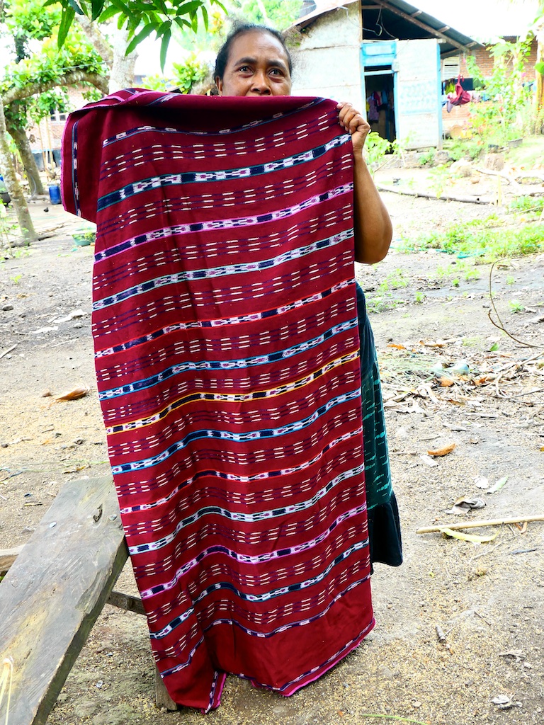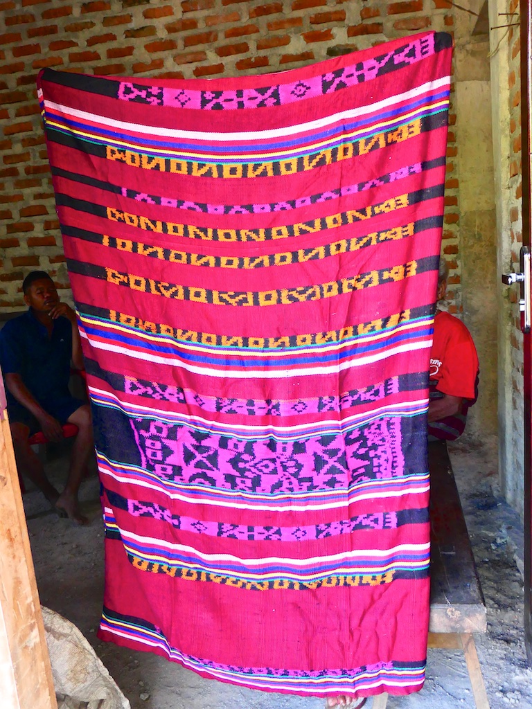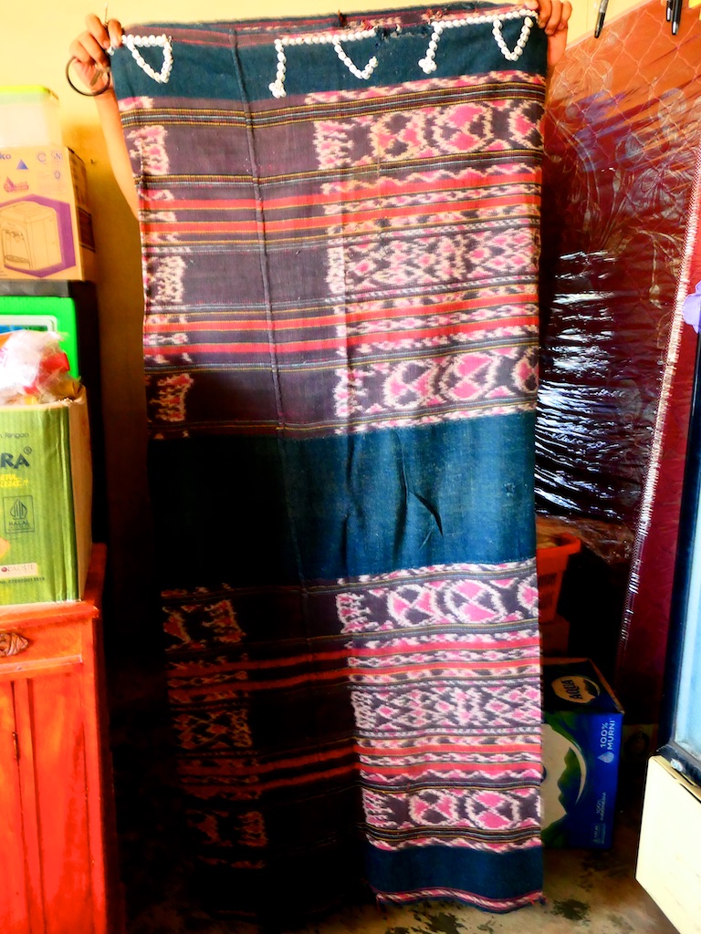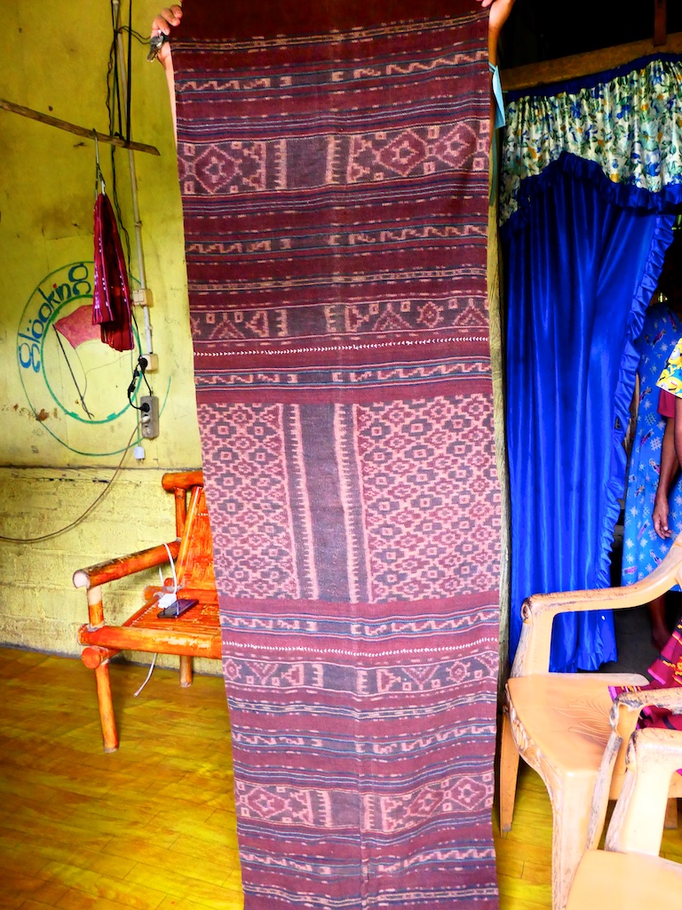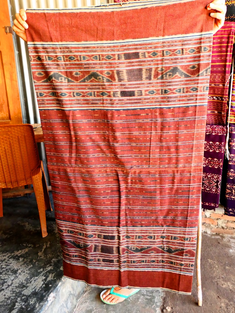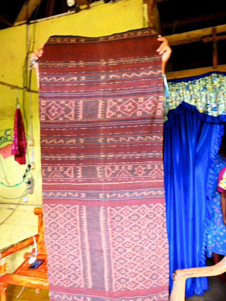 Par contre, au village de Karang Orang, les tisserandes sont nettement plus actives et nous présentent des tissages ikat de meilleure qualité avec la présence de motifs triangulaires figurant des raies manta.