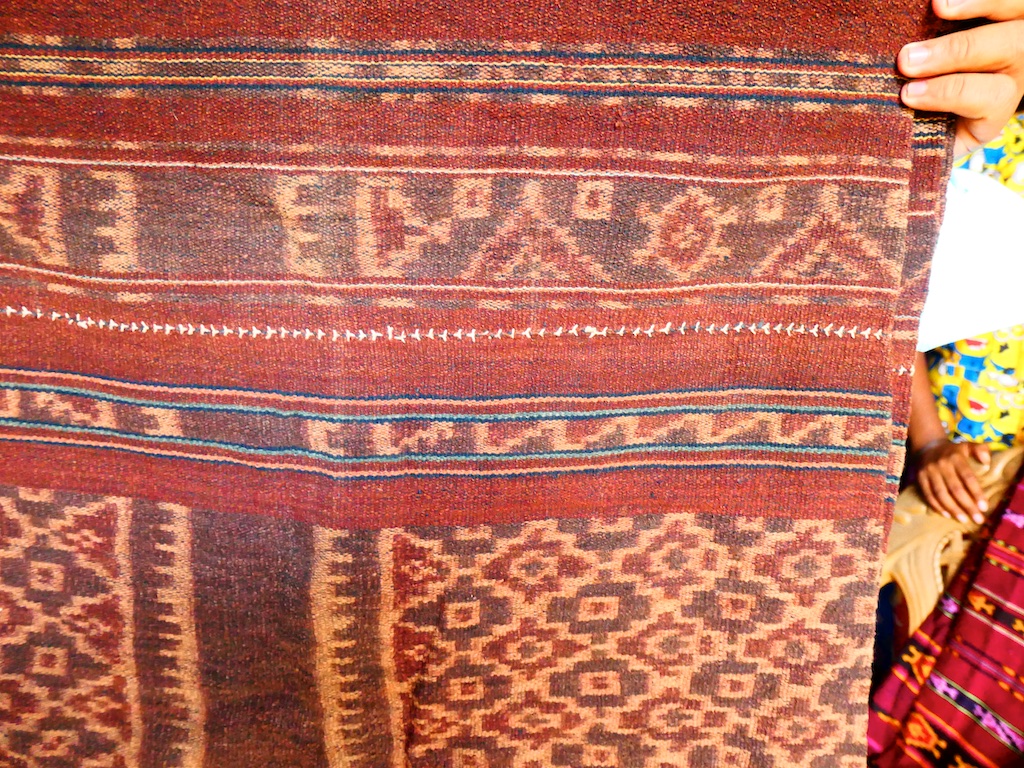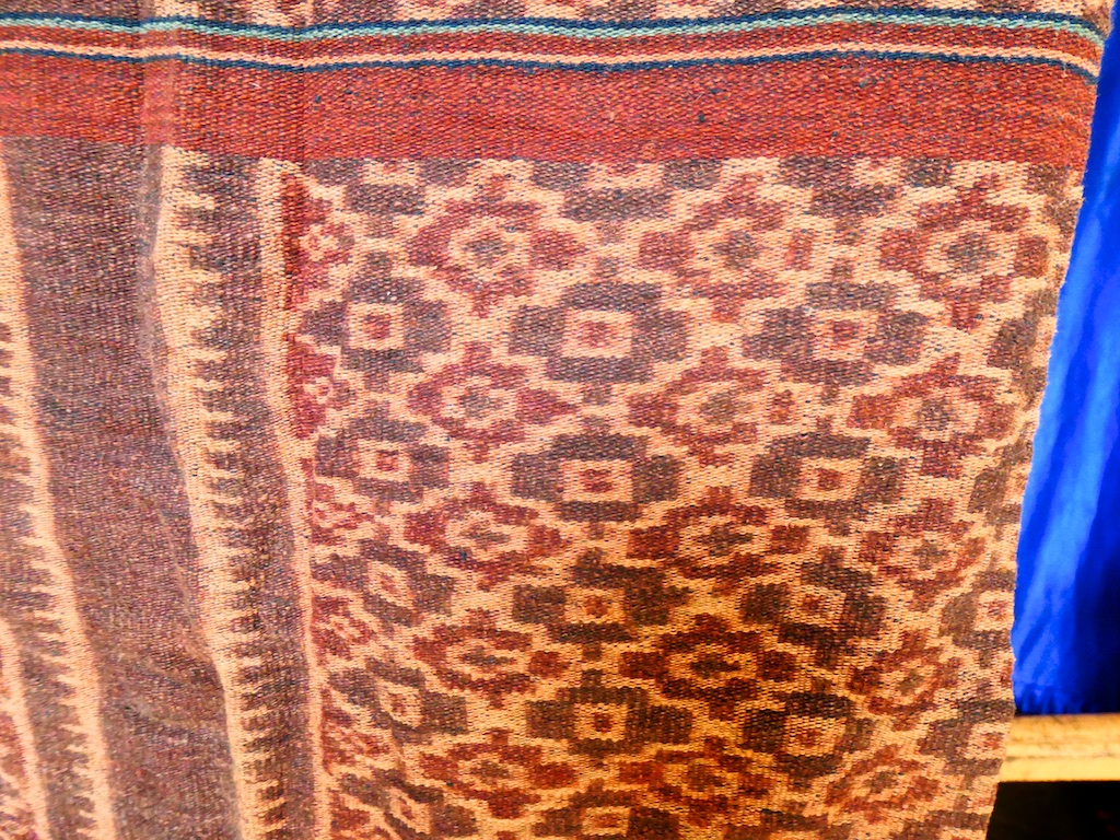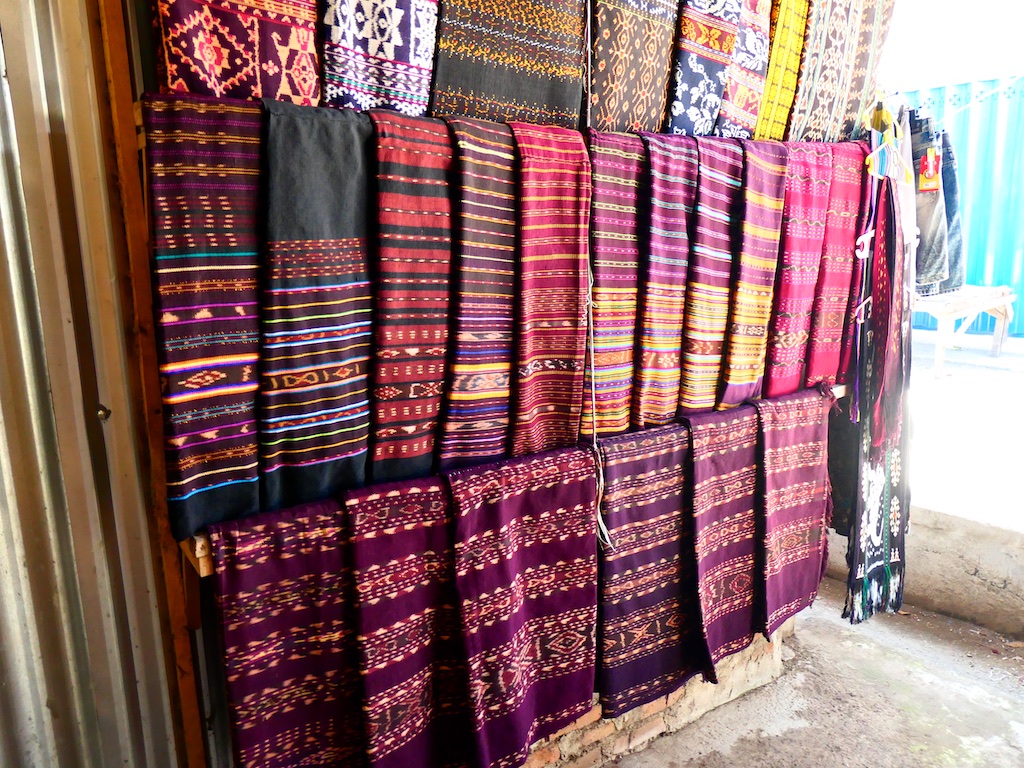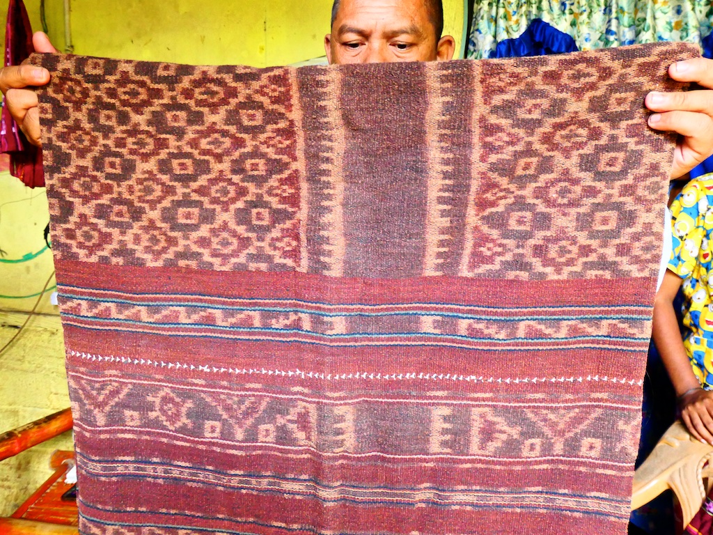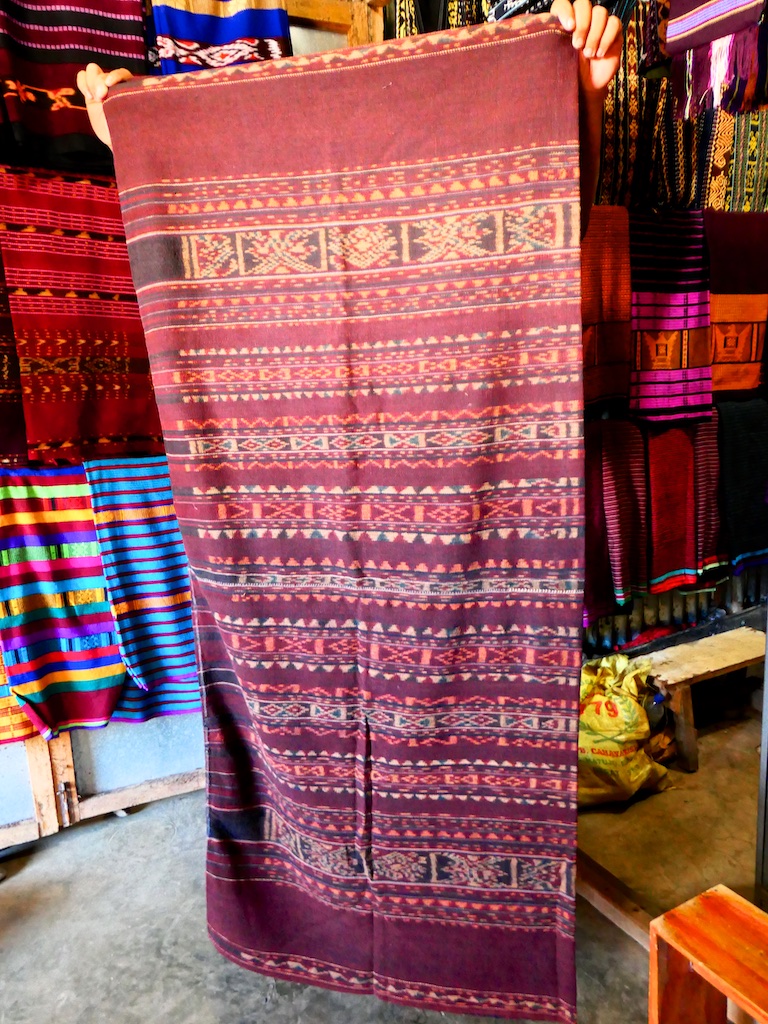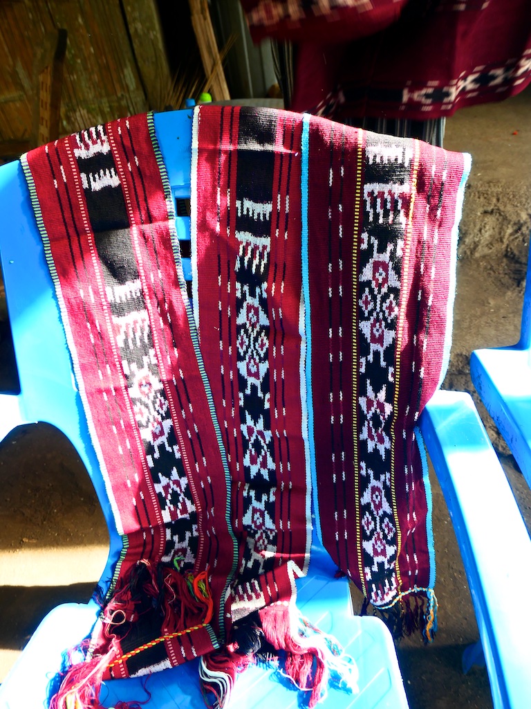 Par contre, au village de Karang Orang, les tisserandes sont nettement plus actives et nous présentent des tissages ikat de meilleure qualité avec la présence de motifs triangulaires figurant des raies manta.