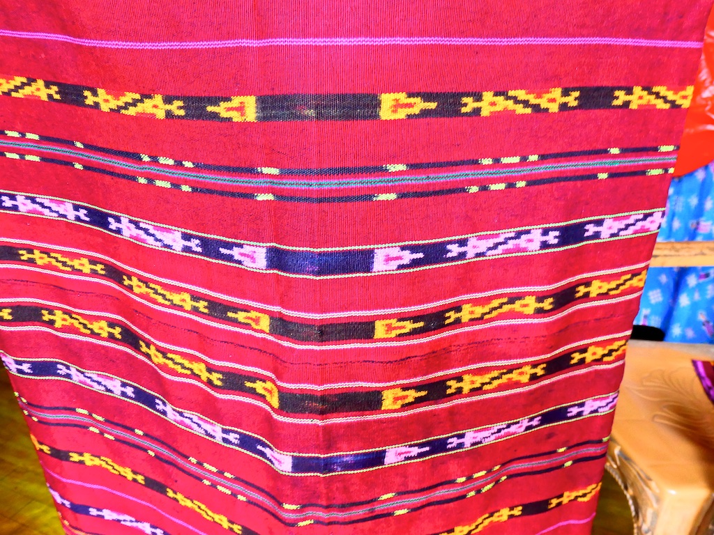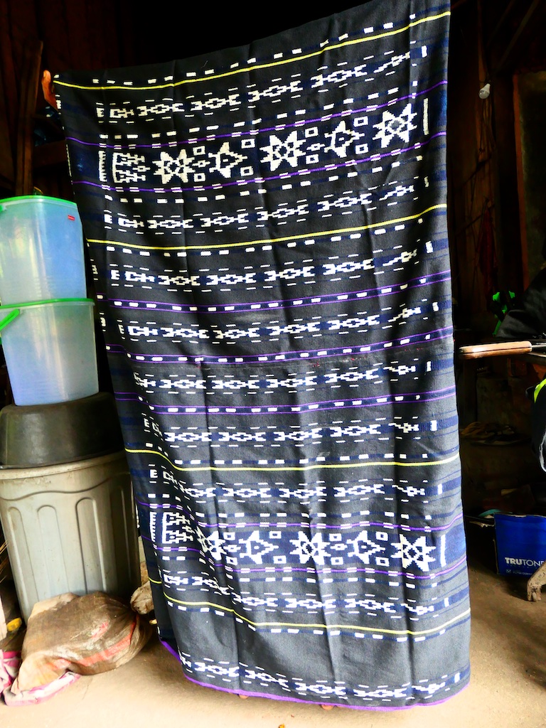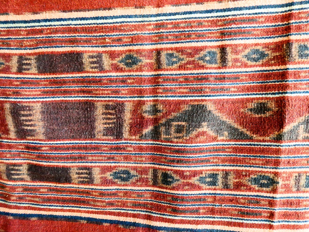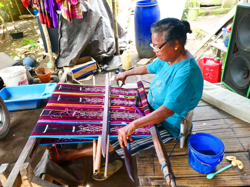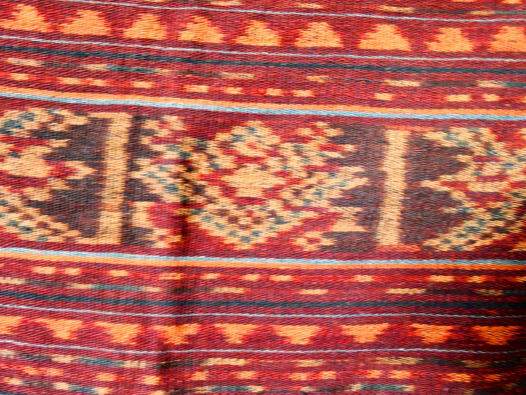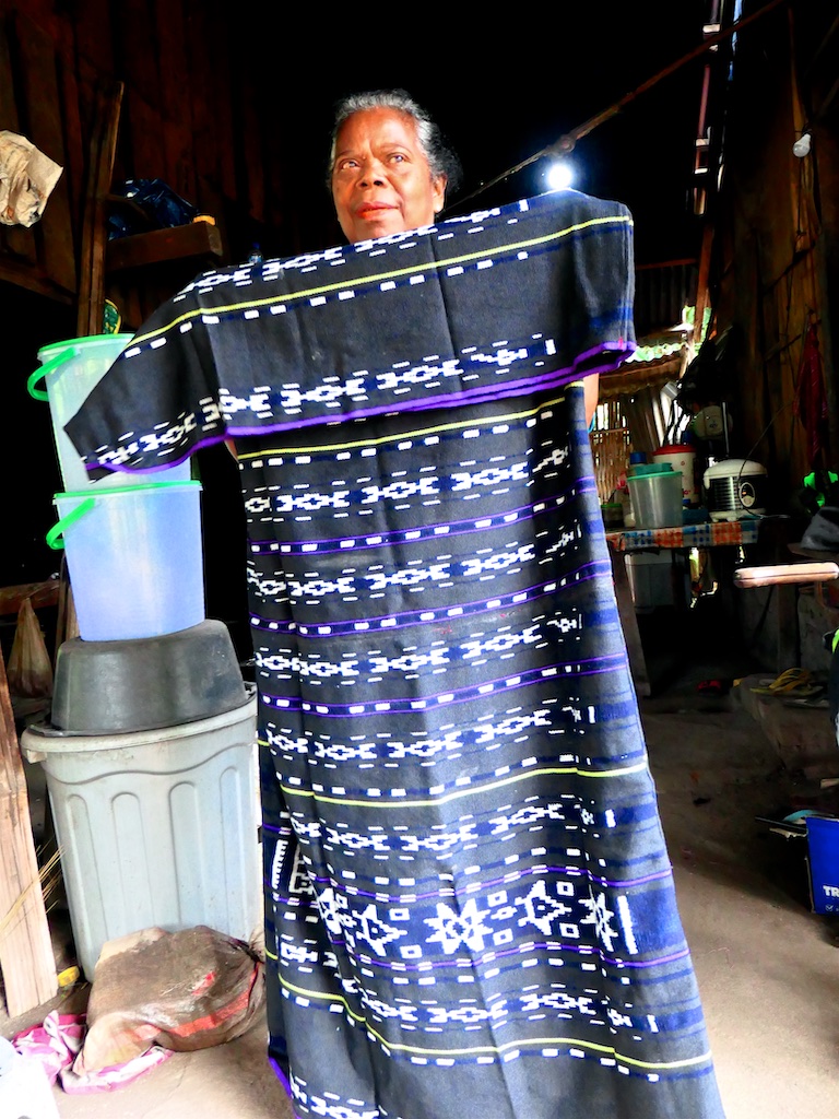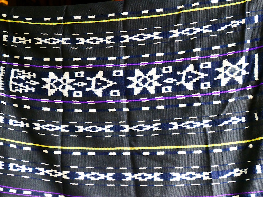 Par contre, au village de Karang Orang, les tisserandes sont nettement plus actives et nous présentent des tissages ikat de meilleure qualité avec la présence de motifs triangulaires figurant des raies manta.