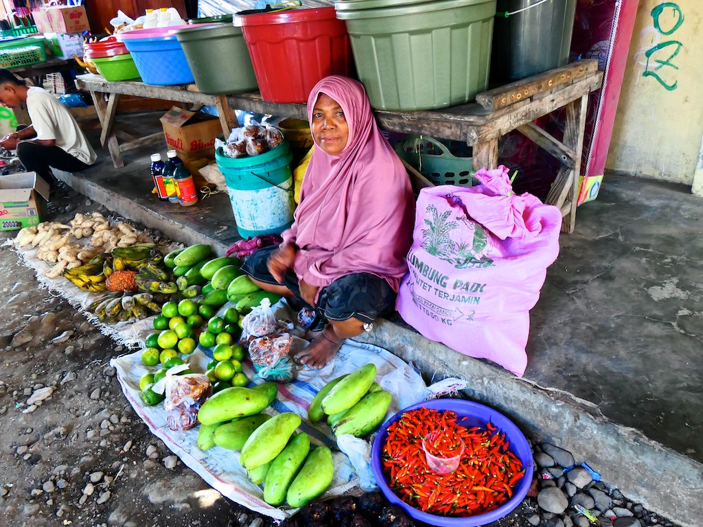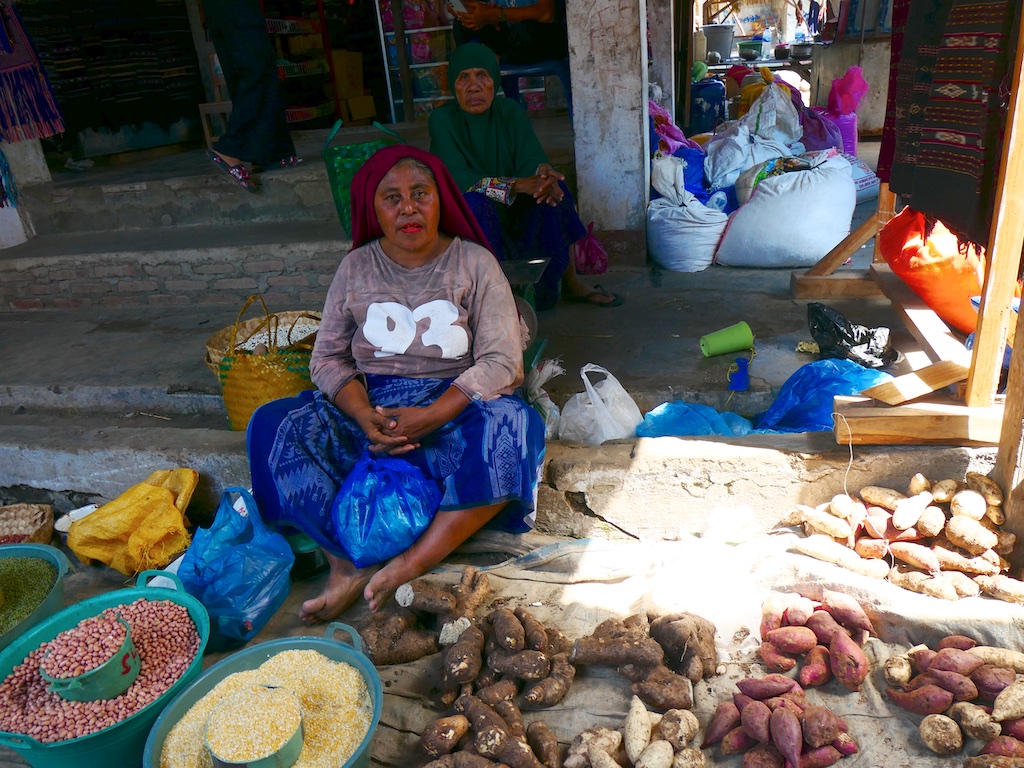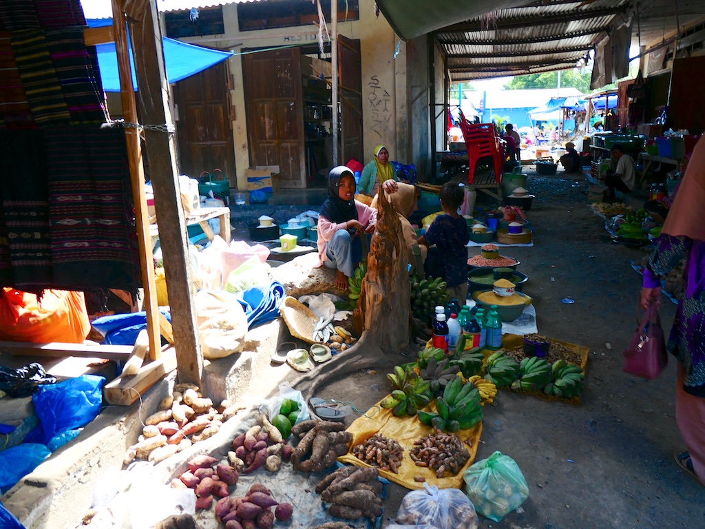 Avant de nous embarquer, toujours en mobylette … sur la route de montagne en mauvais état qui mène à Ata Dei, on part faire un tour au marché local qui réserve parfois de très bonnes surprises.