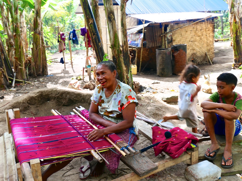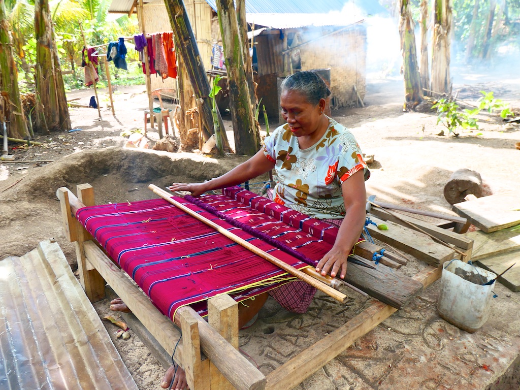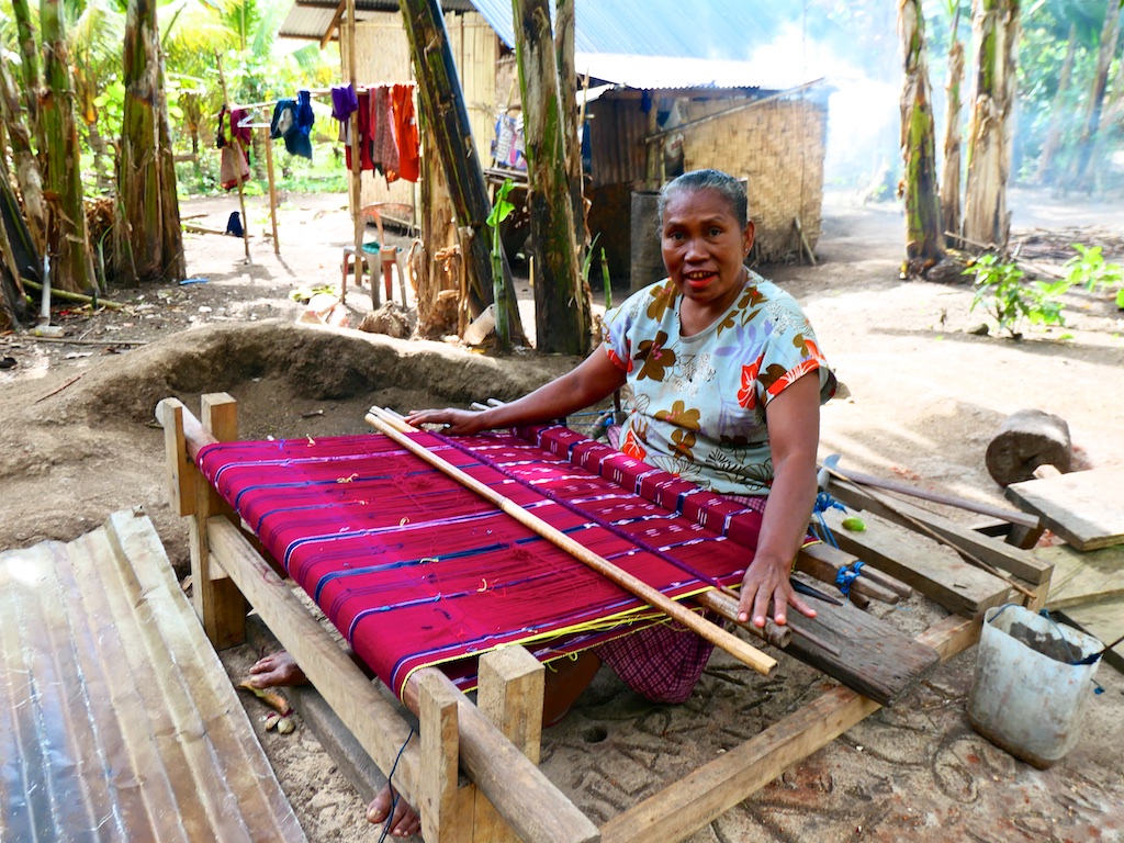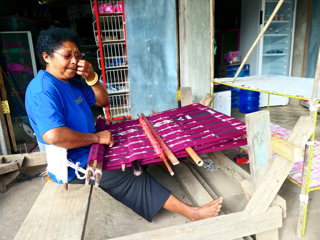 Nous arrivons à un village qui s’appelle Ile Kimok et où quelques femmes sont en train de tisser des sarongs classiques mais en coton du marché.
