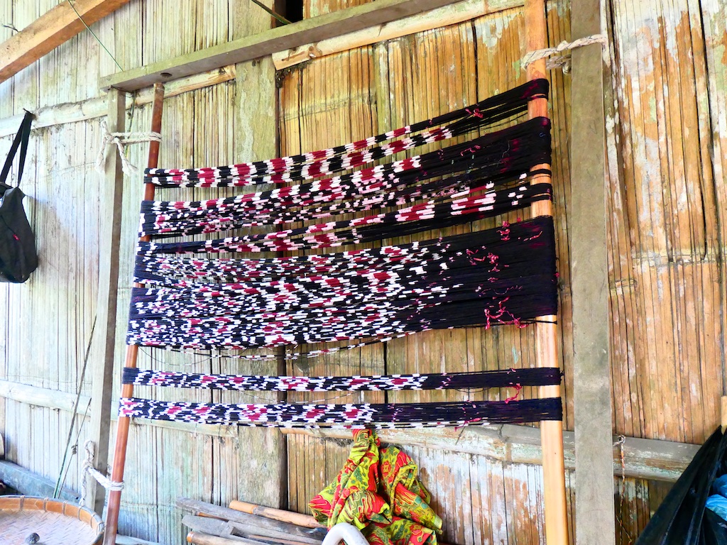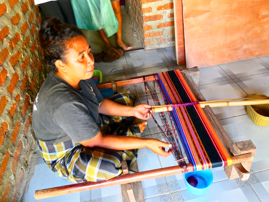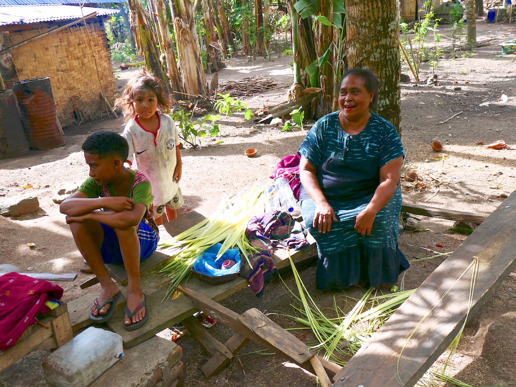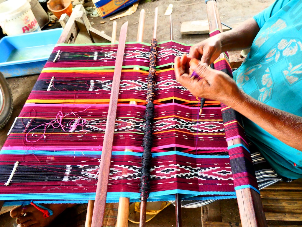 Nous arrivons à un village qui s’appelle Ile Kimok et où quelques femmes sont en train de tisser des sarongs classiques mais en coton du marché.
