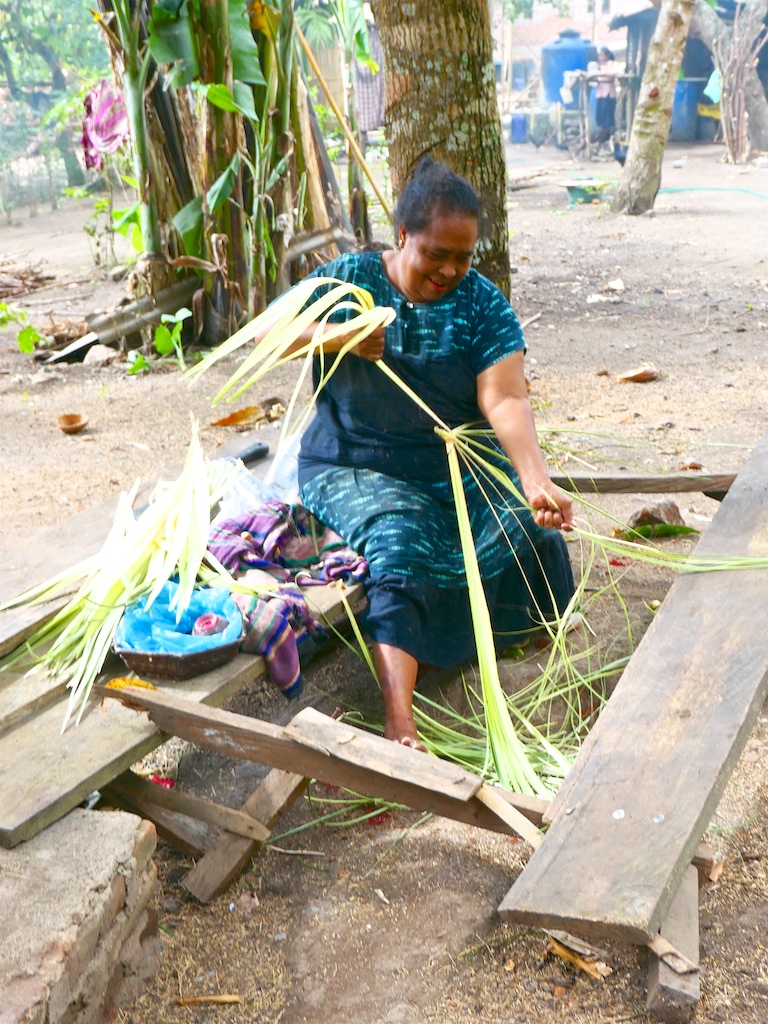 Une des femmes nous montre un beau sarong de Pantar dont le bas est orné de cauris, mais en l’examinant plus attentivement, je constate que le haut est abimé…passons notre chemin !!!
