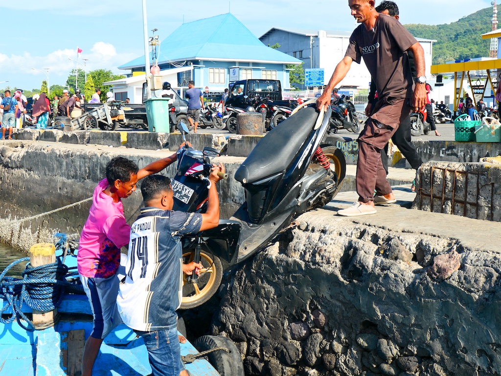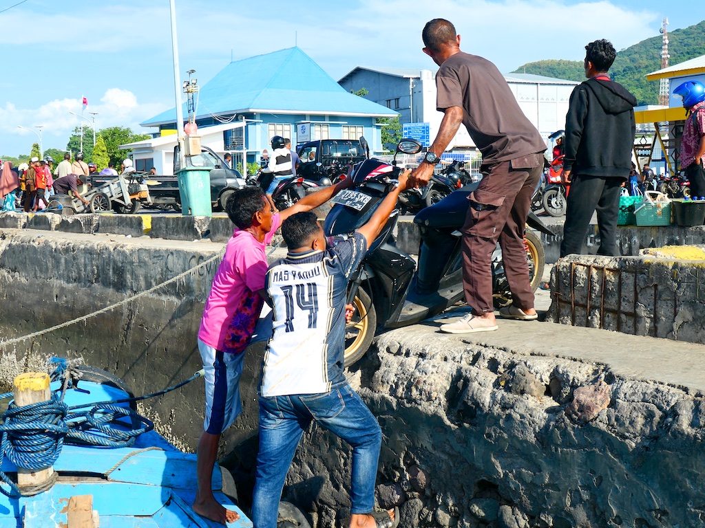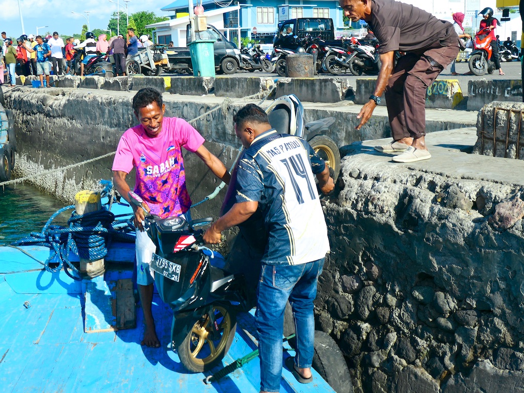 L’embarquement des mobylettes est un grand moment : je croise les doigts pour que l’on ne perde pas une pièce essentielle dans la manoeuvre …
