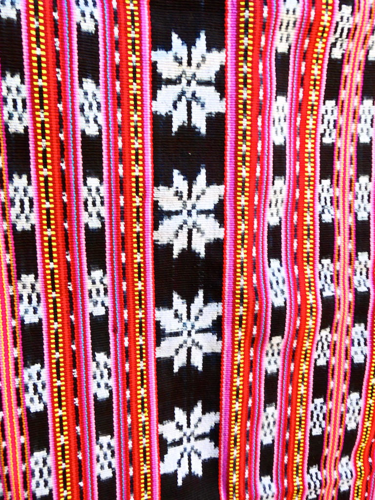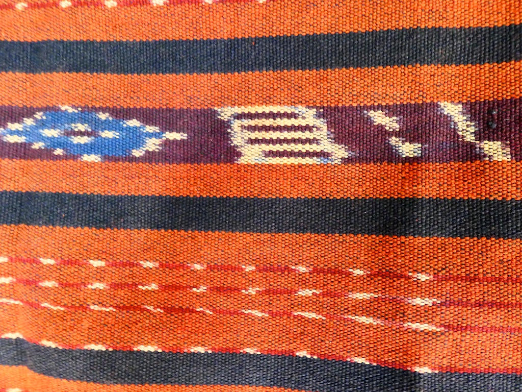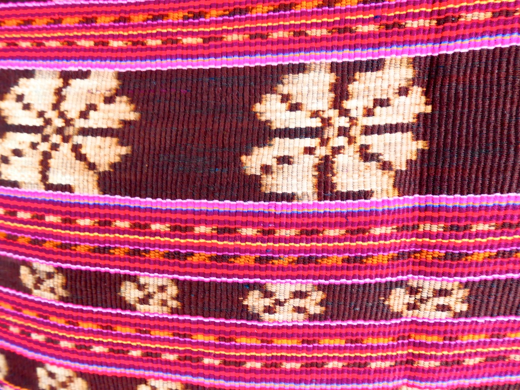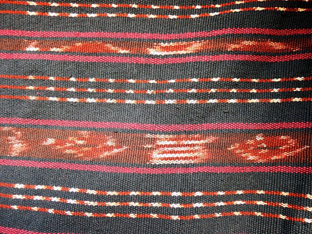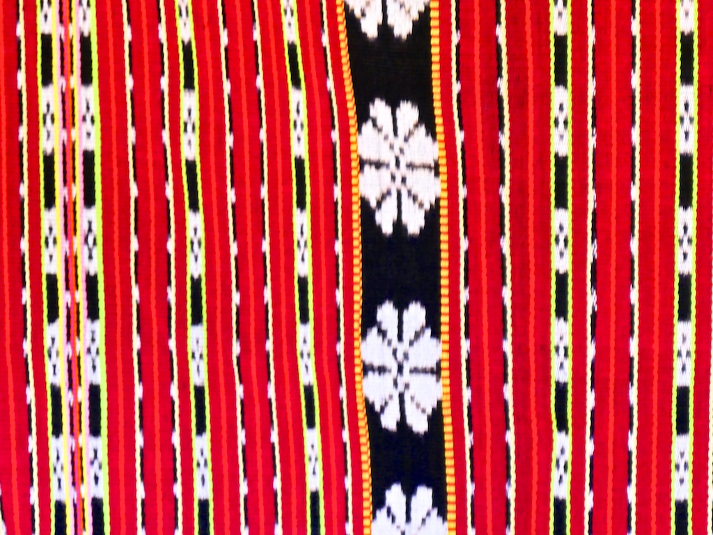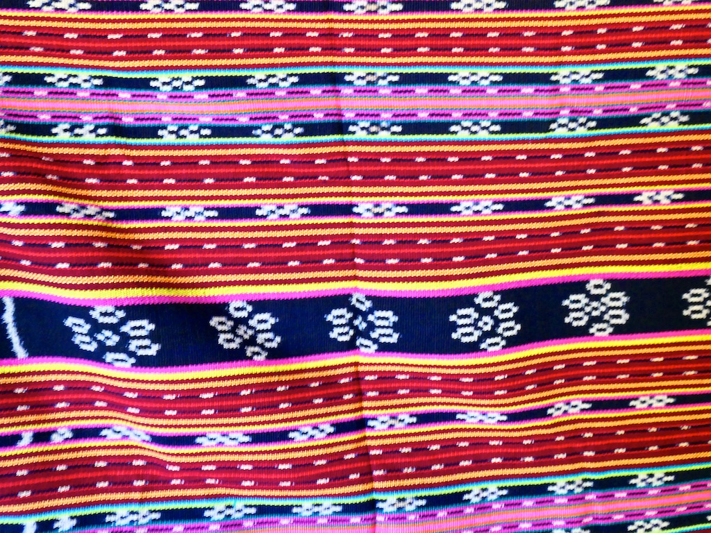 Les tissages de l’ile sont caractéristiques : plusieurs bandes transversales de dominante rouge et bandes noires avec des motifs blancs de fleurs ou d’étoiles …