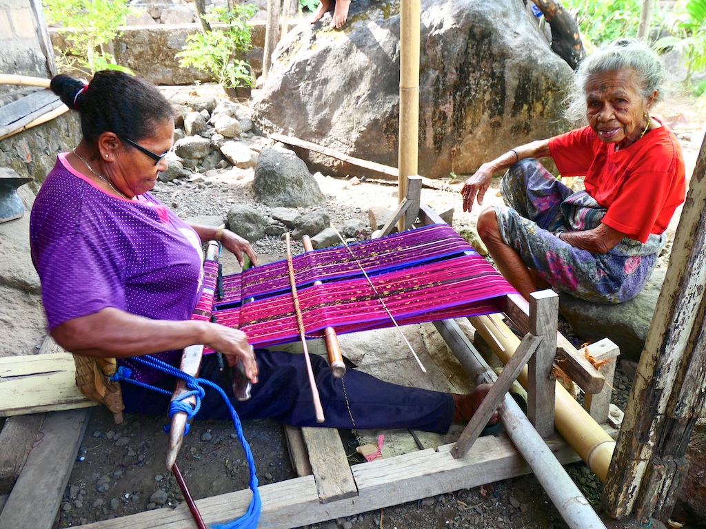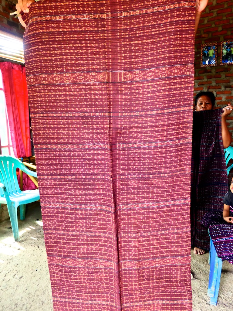 Le type du comptoir est tellement stressé qu’il me fait un billet Larentuka Kupang dans 2 jours au lieu d’un départ de Maumere …bref je vous épargne la suite ce sera une vraie galère de modifier mon billet au départ de Maumere mais en conclusion : on a un jour de plus à passer à Larentuka et en profite pour faire le tour des tisserands autour de Ile Mandiri …un autre volcan mais éteint pour l’instant !!