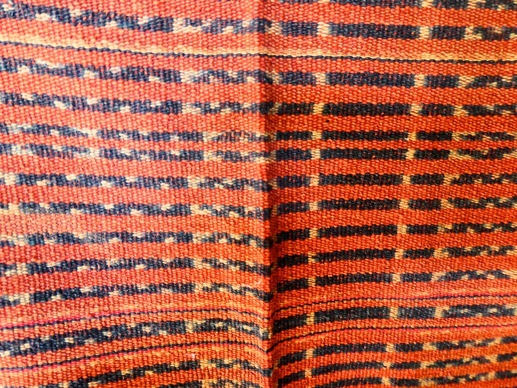Le paréo de tous les jours est principalement bleu foncé ou bleu-noir, teint avec de l’indigo et seulement légèrement animé par des rangées légères de points et de traits qui étaient cachés pendant la teinture.