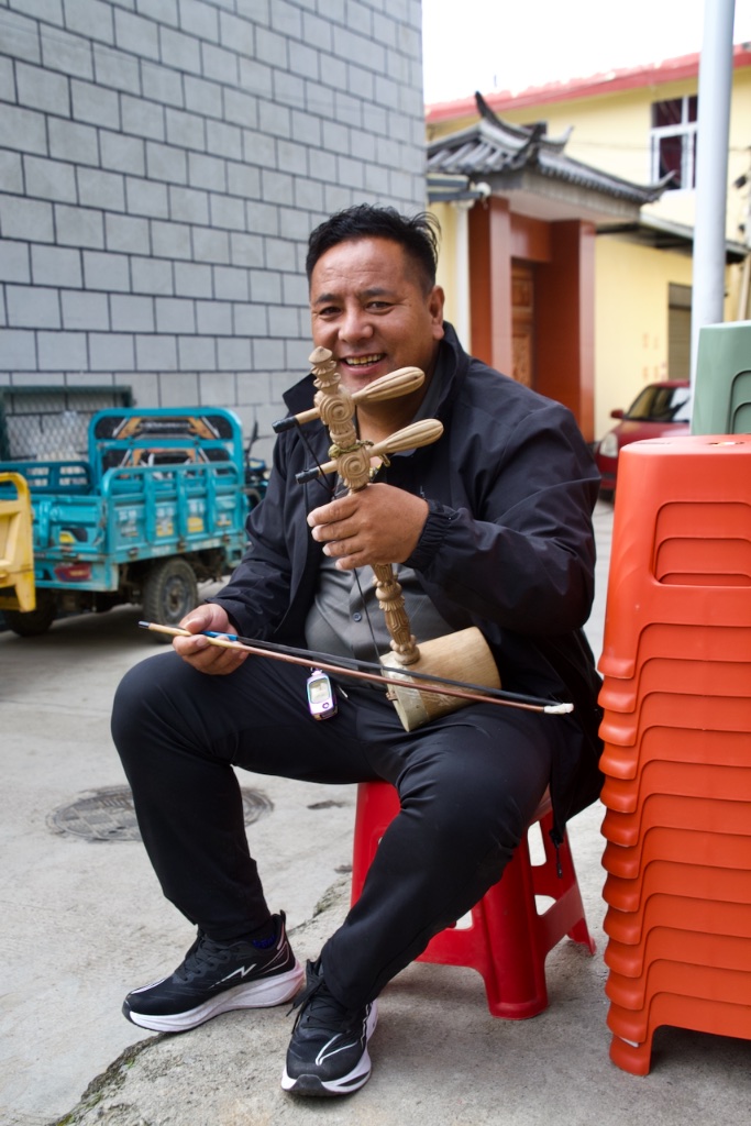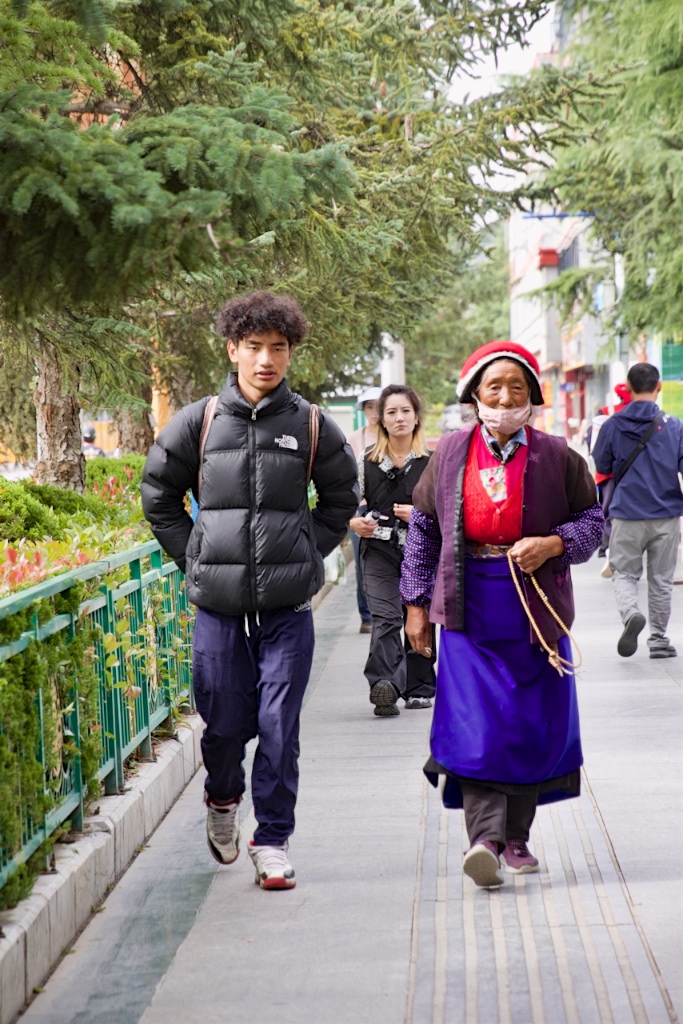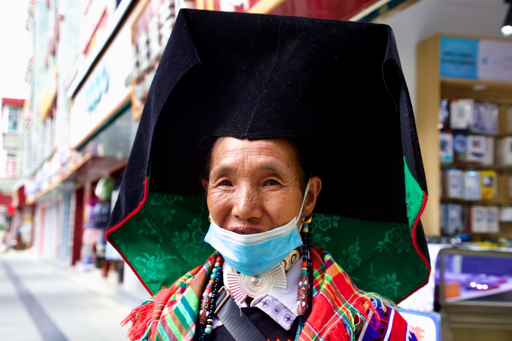 Les femmes tibétaines de la région portent une veste souvent ornée de broderies, un tablier bleu distinctif, et parfois un foulard fuchsia sur la tête.