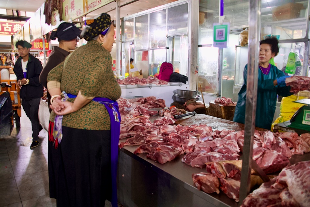 Quelques femmes en costume traditionnel tibétain de la région …se promènent dans le marché …Il s’agit bien du même costume que j’avais vu avec Chen lorsque je suis passée à Shangri La, il y a 10 ans …époque où l’obtention du visa était une vraie galère !!!